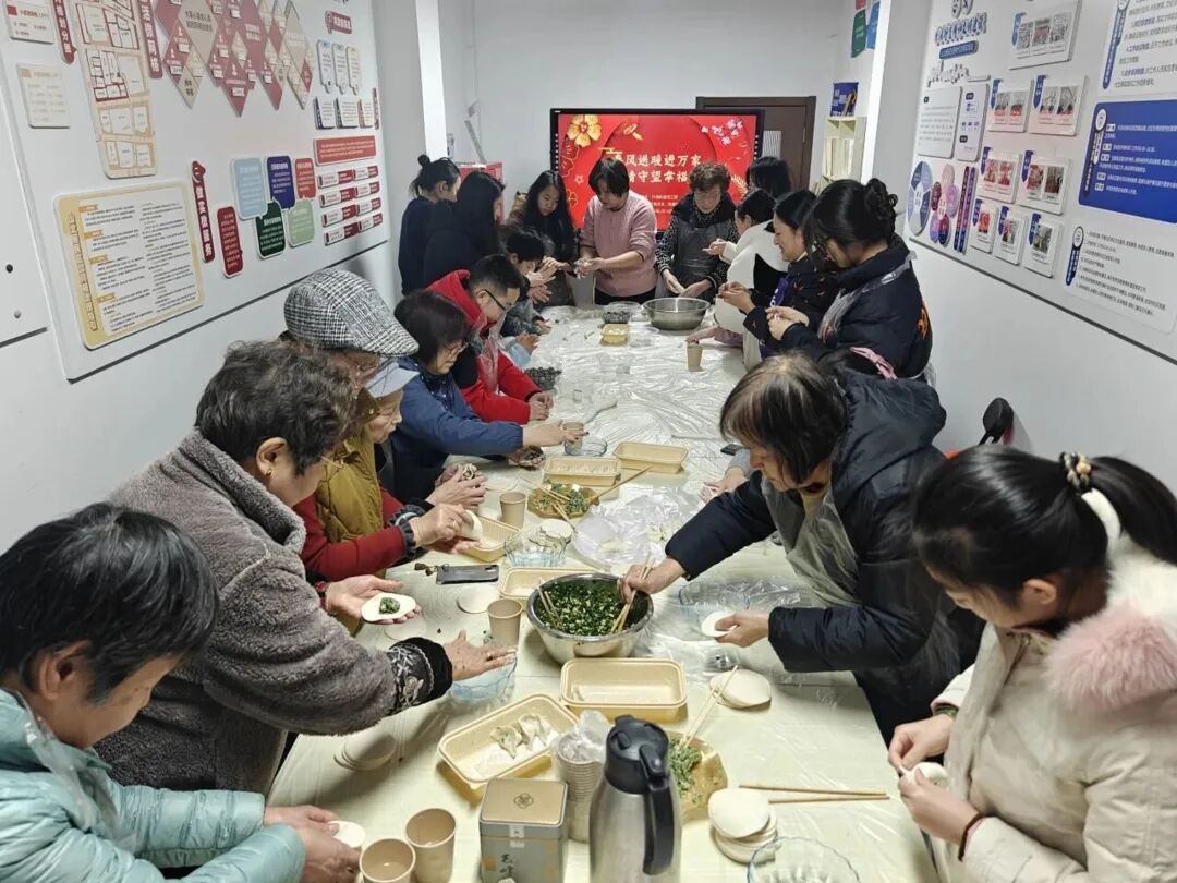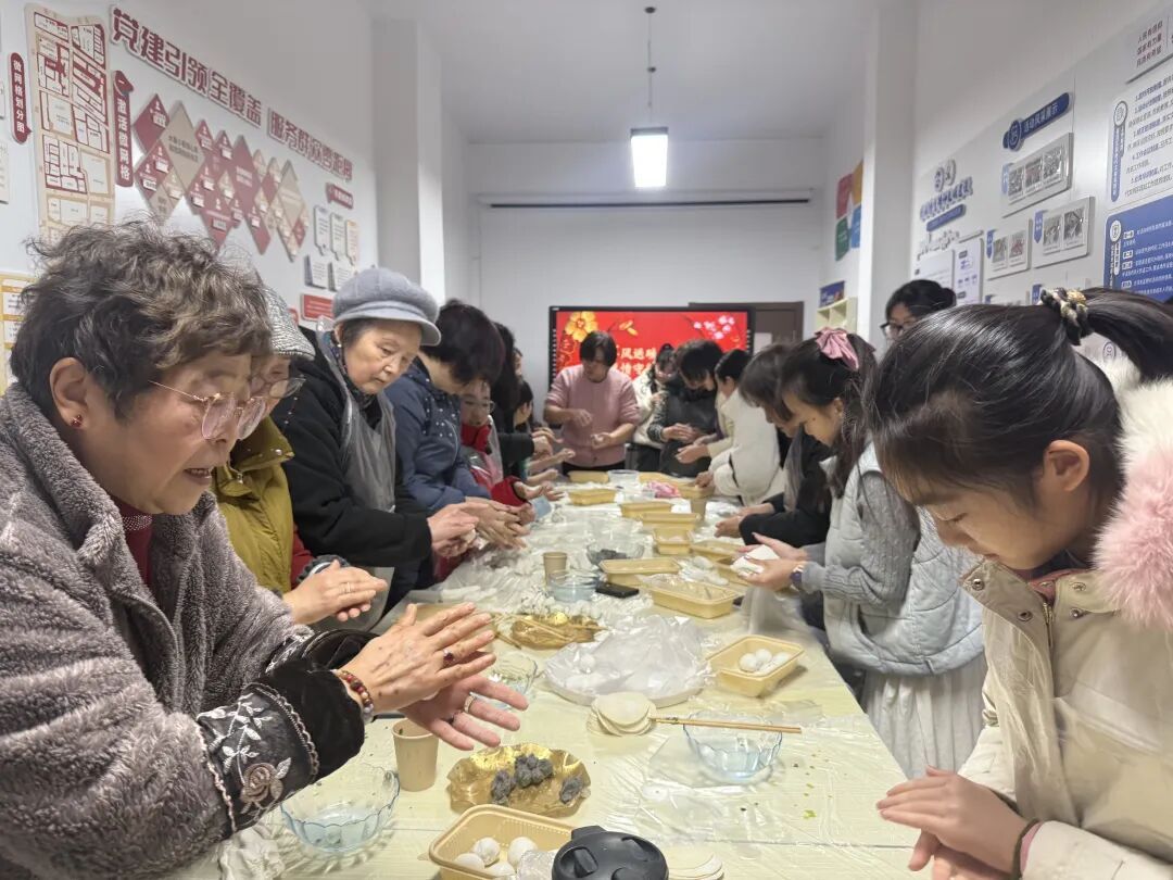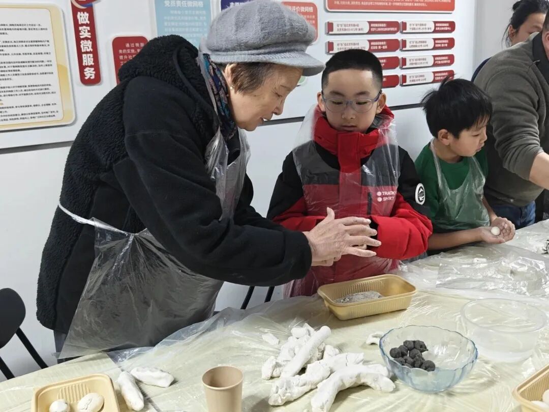 一早,如意里的活动室里暖意融融、欢声阵阵,桌子上,早已摆好了白白胖胖的汤团粉、香甜软糯的豆沙馅、鲜香可口的饺子馅,氛围感拉满。包汤团的人群中,既有手法娴熟、经验丰富的老年居民,动作一气呵成,一个个圆润饱满的汤团在指尖成型;也有不少头一回动手的学生族,满脸好奇又略带生疏,见状,有经验的阿姨们主动上前,手把手耐心教导,从搓粉、摊皮到放馅、收口,一步步细致讲解,温柔纠正孩子们的手法。不一会儿,孩子们就渐渐找到了窍门,虽然包出的汤团大小不一、形态各异,却满是童真与心意。整个活动室里,欢声笑语不断,搓粉声、谈笑声交织在一起,暖意融融,大家在互帮互助、动手协作的过程中,不仅学会了手艺,更拉近了彼此的距离,真切感受到了“邻里一家亲”的温暖,也让年味在烟火气中愈发浓厚。