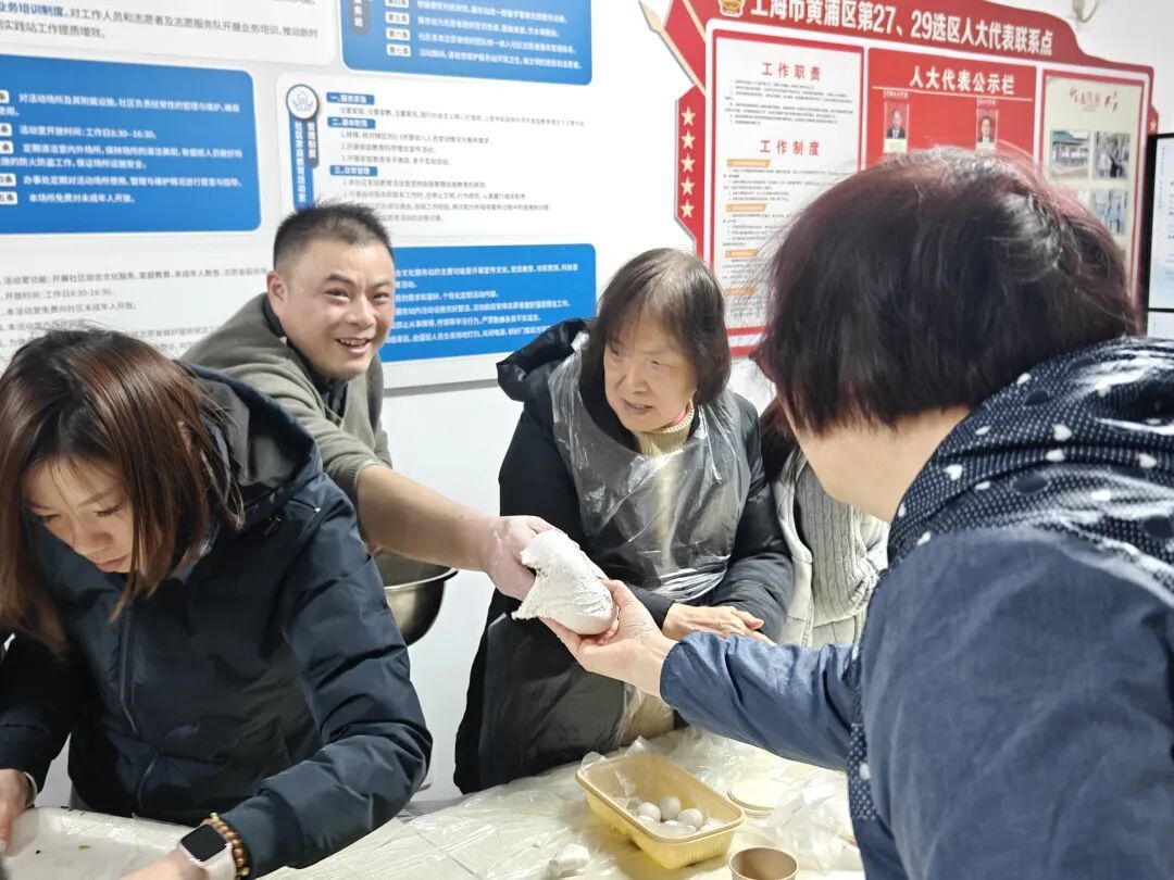 白白嫩嫩、惹人喜爱的汤团、饺子,承载着大家对新春的期盼和对团圆的向往。按照事先约定,这些手工制作的汤团和饺子,一部分由居民们带回家,端上年夜饭的餐桌,分享这份亲手劳作的喜悦;另一部分则现场下锅煮熟,连同部分生制品一起,挨个儿送到小区里的独居老人、以及除夕当天坚守在岗位上的人群手中,让他们在忙碌与孤单中,也能感受到节日的温暖与关怀。