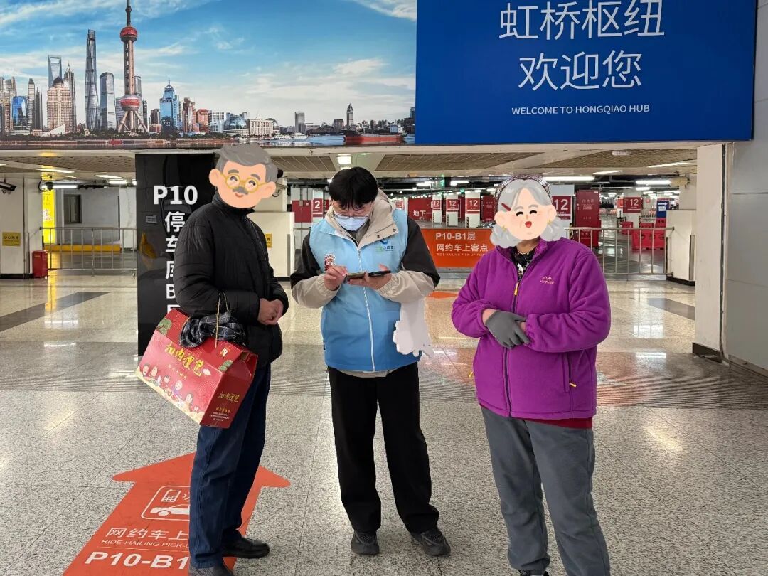 出站口,一位男士不停地张望,眉头紧锁。志愿者孙竹影敏锐地察觉到他的异样,主动上前询问。原来他要接来上海过年的父母,但是不知道在哪个出站口等待,临近列车到站时间了,所以很着急。