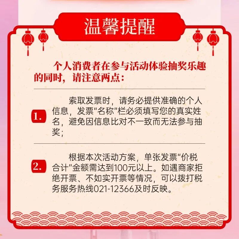温馨提示 2月12日起,上海市有奖发票活动正式启动。 活动期间,个人消费者在上海市零售、餐饮、住宿、文化艺术、娱乐、旅游、体育、居民服务等行业消费,即可参与抽奖。 这里提醒大家注意两点: 一是索取发票时,请务必提供准确的个人信息,发票“名称”栏必须填写您的真实姓名,避免因信息比对不一致而无法参与抽奖。 二是根据本次活动方案,单张发票“价税合计”金额需达到100元以上。 如遇商家拒绝开票、不如实开票等情况,可以拨打纳税缴费服务热线021-12366及时反映。 相关链接 1.一图读懂 | “乐享消费 有奖发票”2026年上海市有奖发票活动 2.上海市有奖发票活动常见问答Q&A 3.@个人消费者,有奖发票小贴士请查收!