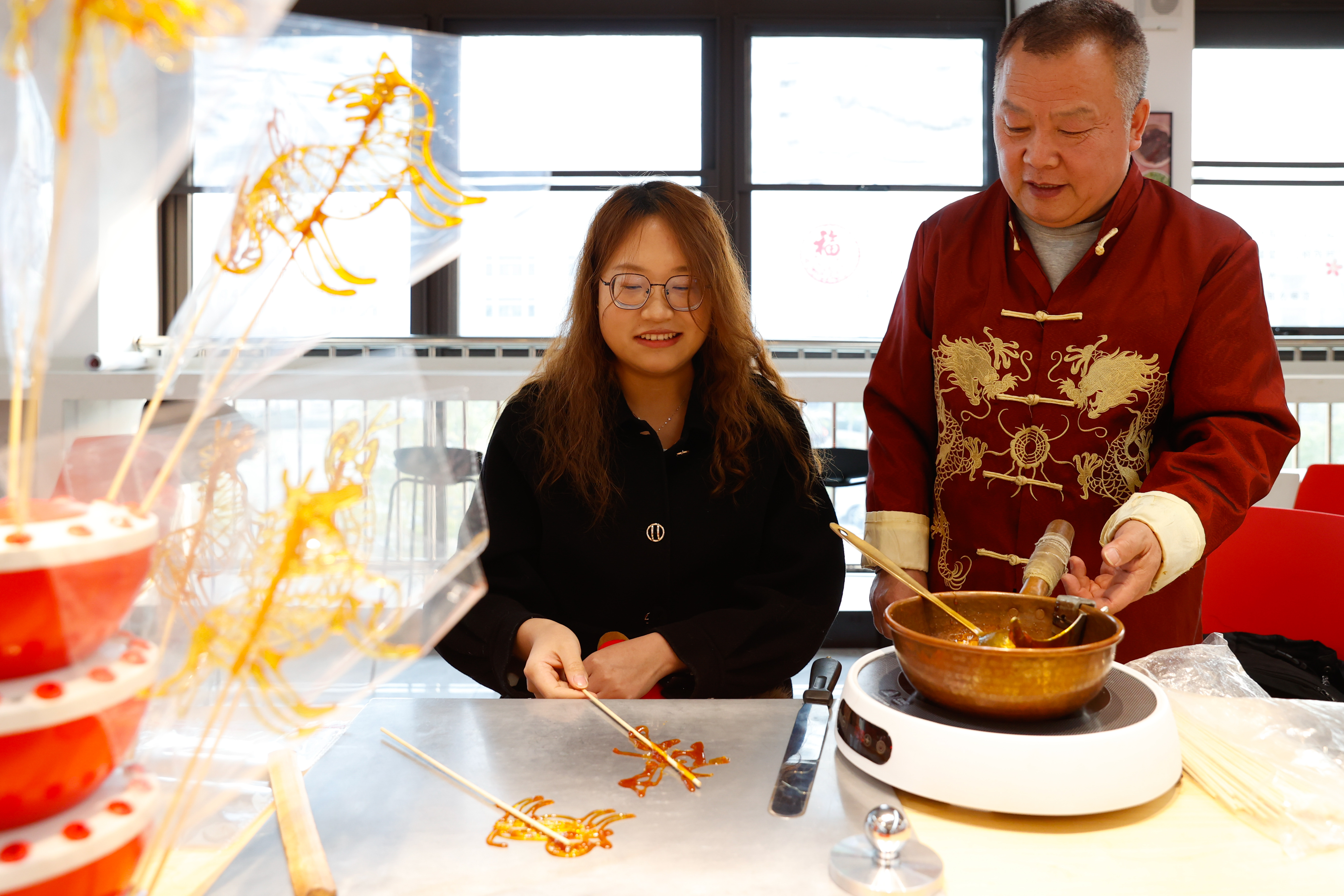 学生跟着师傅学习糖人制作