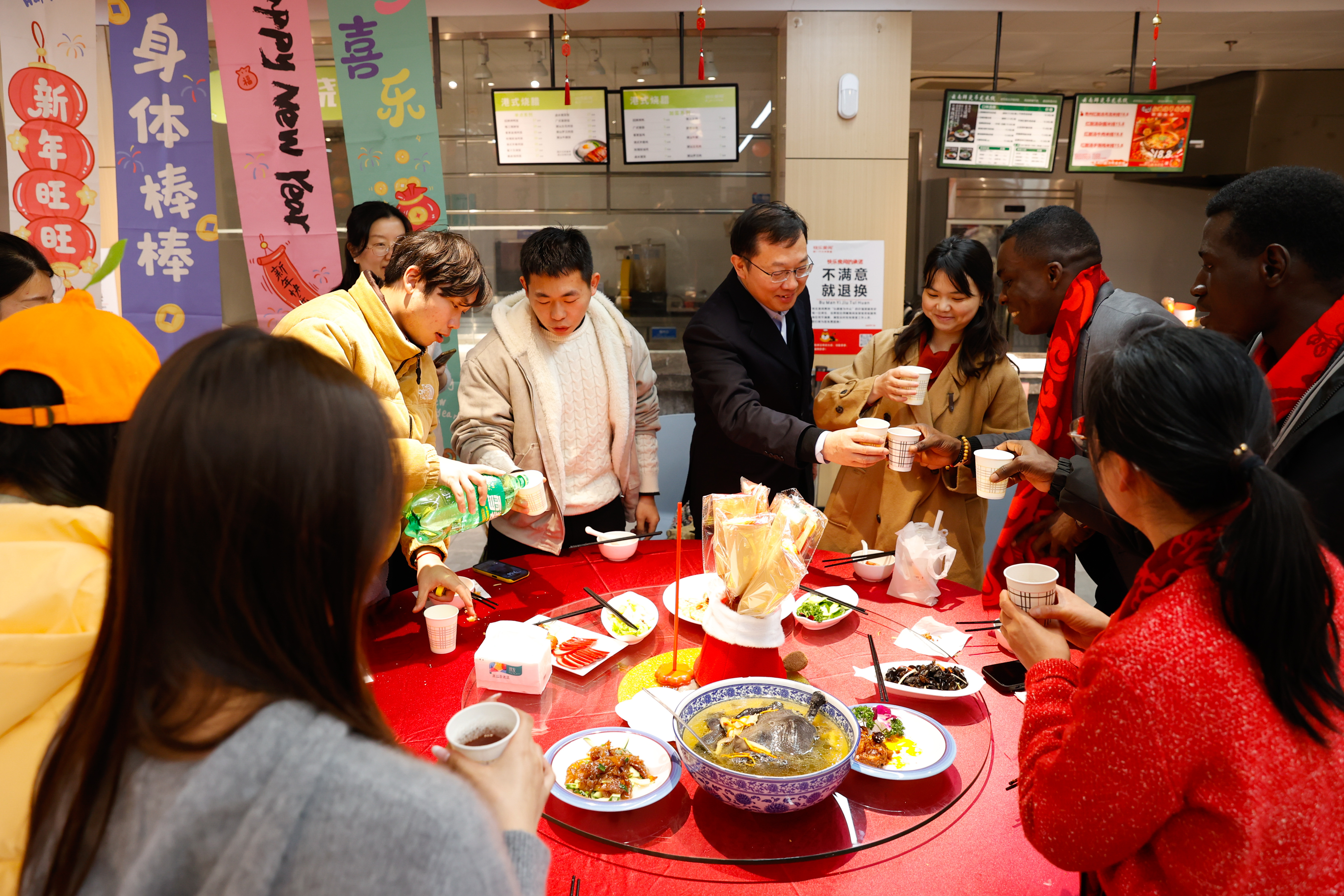 2月11日是南方农历小年,上海对外经贸大学松江校区的学生食堂张灯结彩,暖意融融。在丙午马年春节即将到来之际,学校2026年师生迎春年夜饭如约而至,教师代表与百余名留校学生共飨家宴,同庆佳节、喜迎新春。