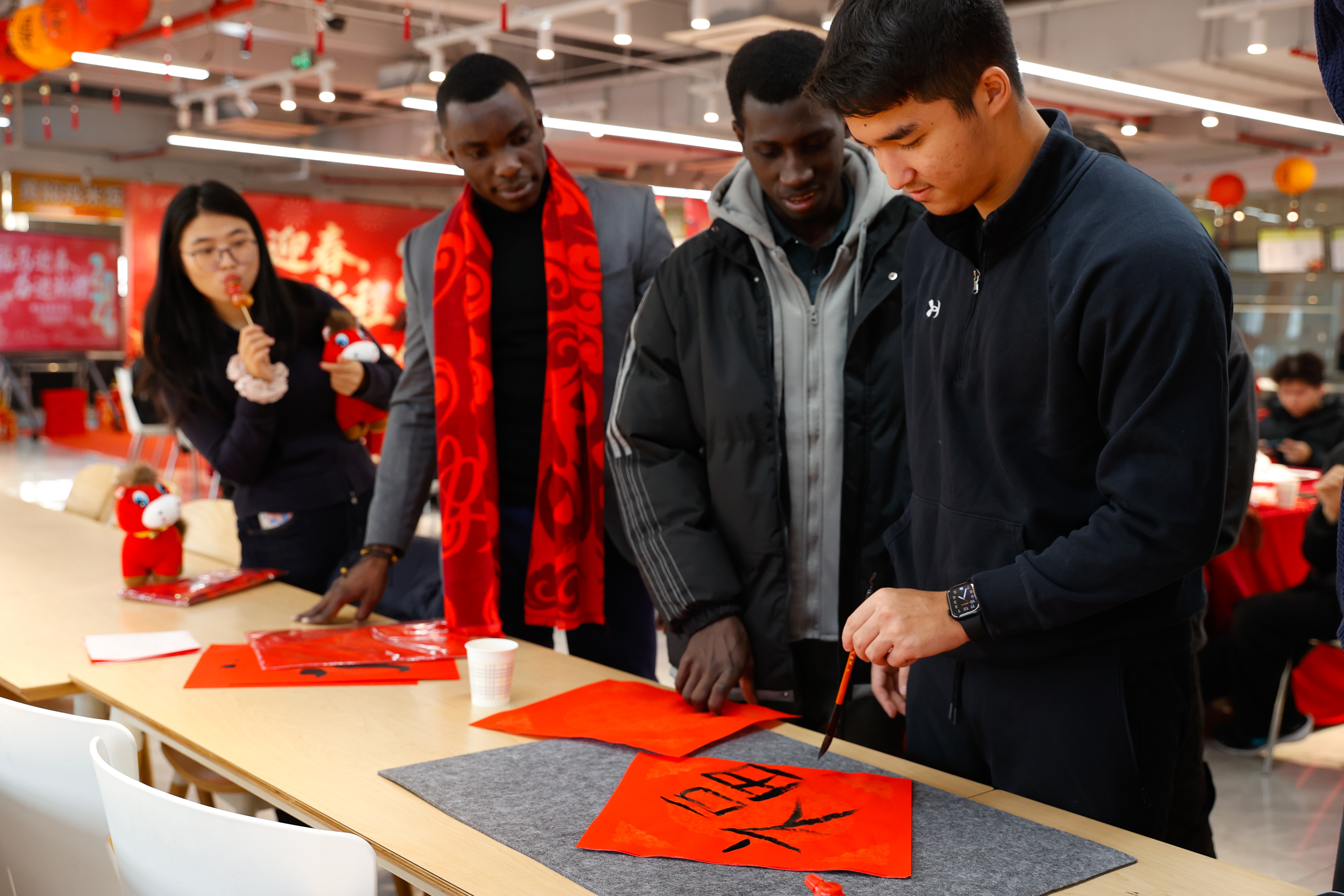 当天下午,活动现场早早变身“新春乐园”,一排排红灯笼高挂,“福”字、春联随处可见,年味十足。现场制作的糖人、冰糖葫芦甜香四溢,备受追捧的当属“抓福马”娃娃机,引得师生们跃跃欲试,试图抓取憨态可掬的小马玩偶,欢声笑语不断。来自乌兹别克斯坦、刚果(布)等国家的留学生,与新疆维吾尔族的少数民族学生一同沉浸在浓郁的传统年俗氛围中。活动还穿插了游戏互动环节与抽奖环节。