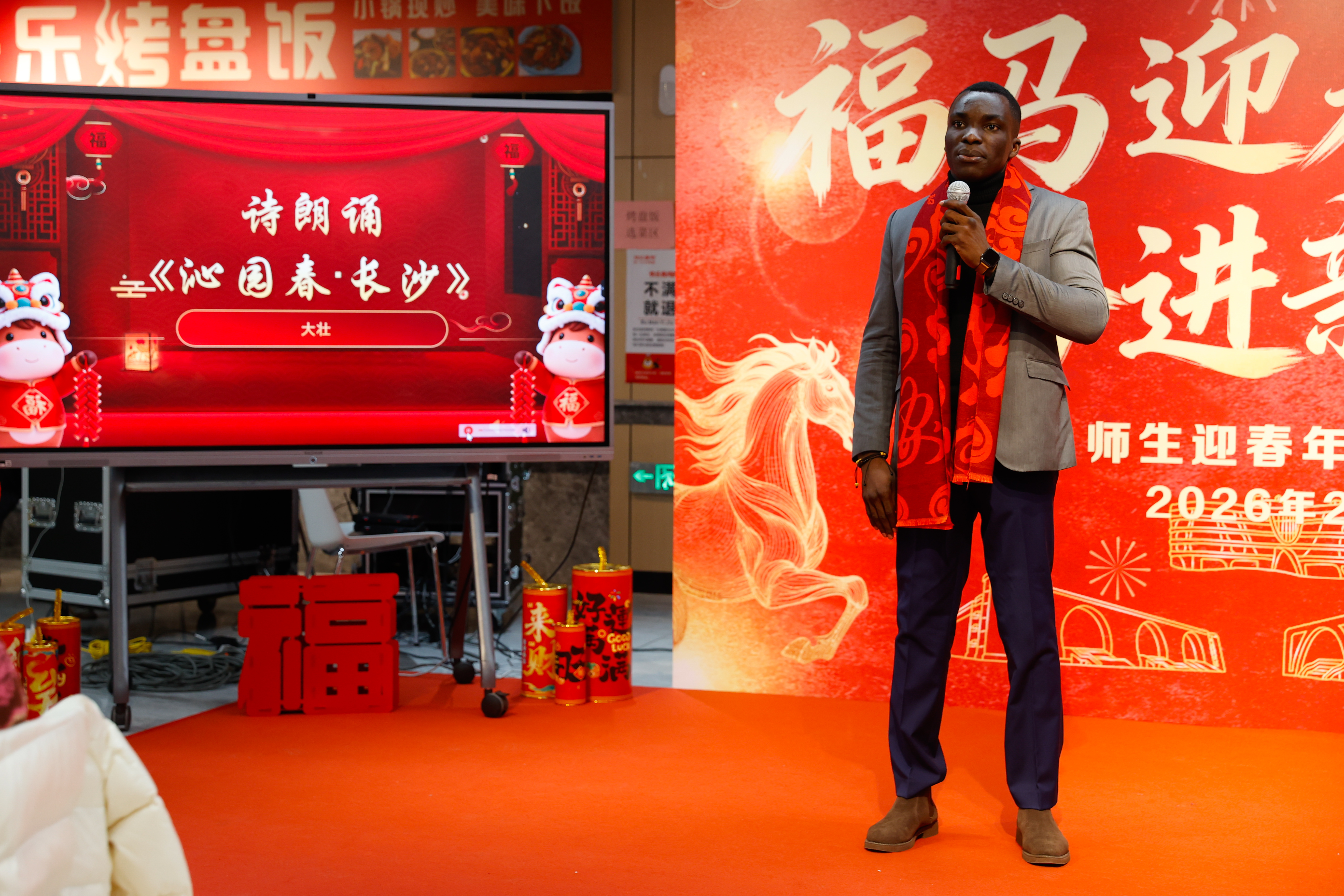 晚宴特别设置了文艺表演环节,由留校学子带来的乐器二重奏、诗朗诵、歌曲对唱等节目轮番登场,点燃全场热情。来自刚果(布)的留学生大壮流利而深情的朗诵了诗词《沁园春·长沙》。“数风流人物,还看今朝!”话音刚落,观众席便传来阵阵掌声。校长汪荣明登台献唱《难忘今宵》。“共祝愿,祖国好,祖国好!”熟悉的旋律在现场回荡,将节日的欢乐氛围推至顶峰。