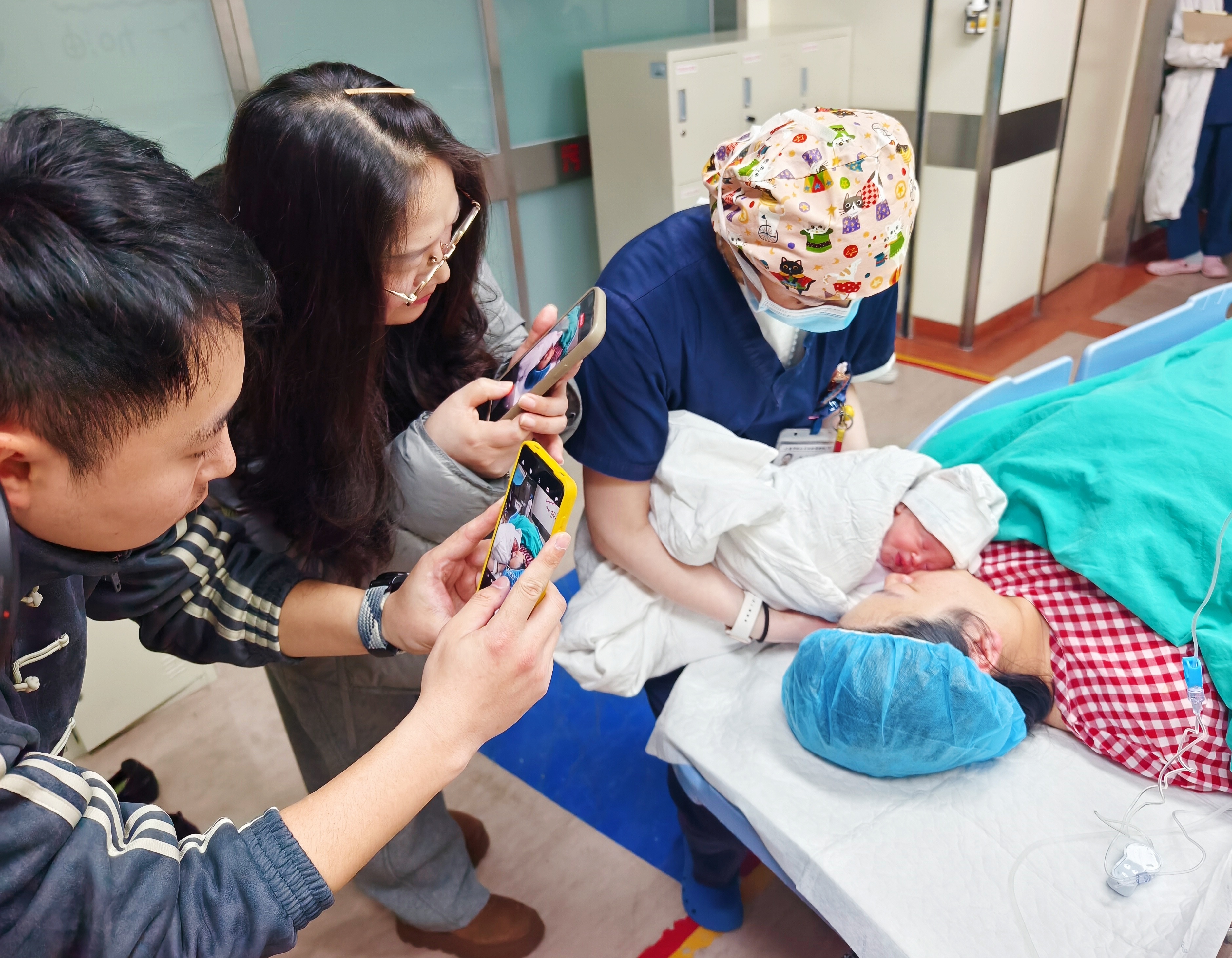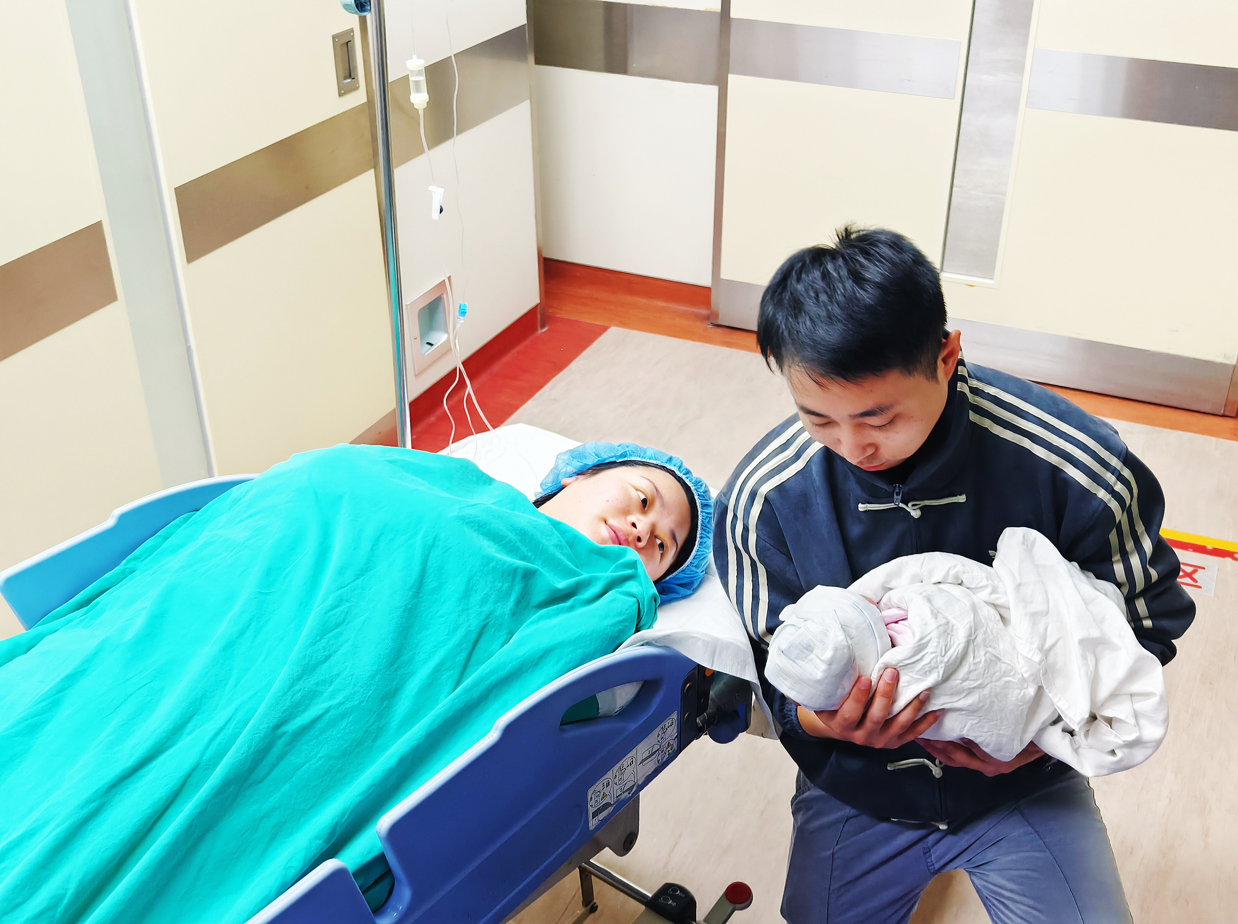 上午9时许,随着产房大门打开,在产房外焦急等待了许久的相思捷终于接到了期盼已久的妻女。听到宝宝响亮的哭声,望着妻子苍白的面孔,他忍不住上前轻抚脸颊、温声宽慰。聊了两句后,又赶忙抱起宝宝凑到妻子旁边,一家人初一碰面,暖心团圆。