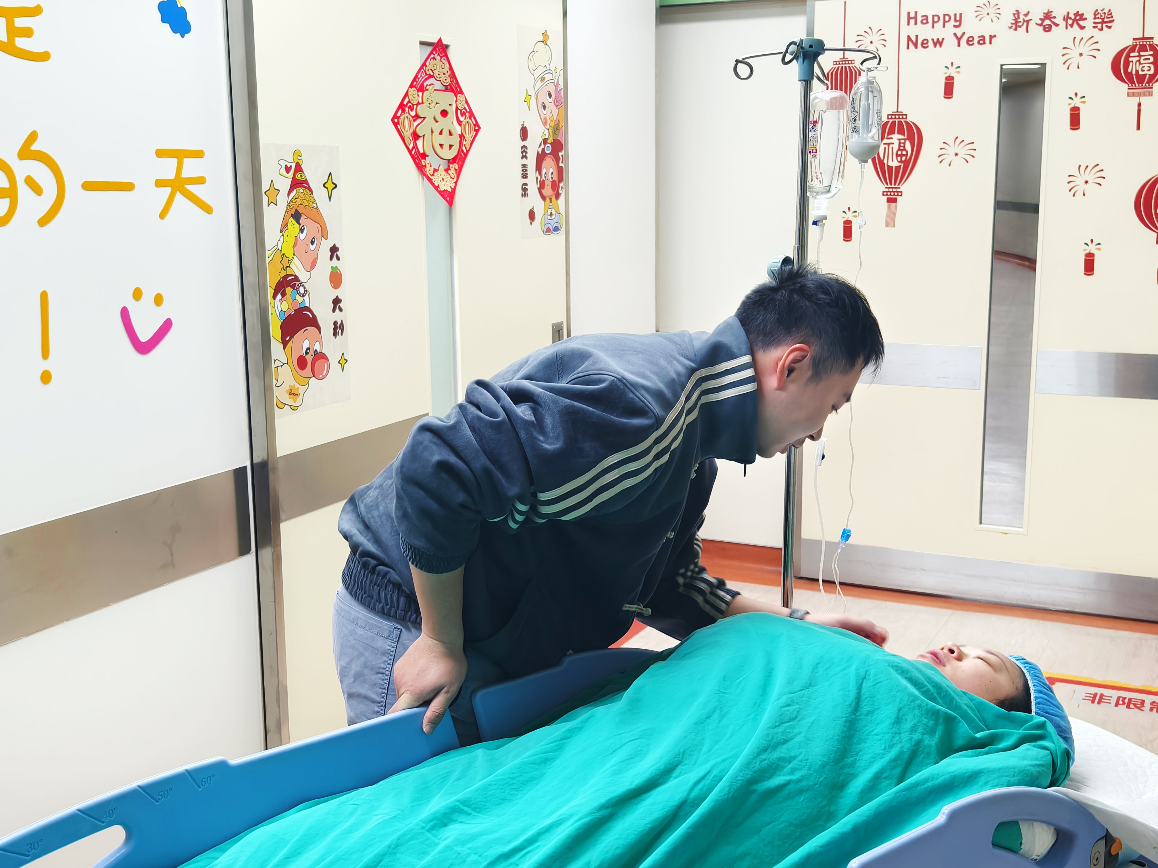 刚一到爸爸怀里,宝宝就停止了啼哭,软软的小脸上神情舒展。望着丈夫怀抱里乖巧可爱的女儿,躺在床上的费诞妮轻轻转过头,在孩子小脸上印上一个轻柔的吻。随后,相思捷小心翼翼地将孩子放到护士怀里,用手机记录下妻女的暖心互动,发给在外面等候的家人报平安。