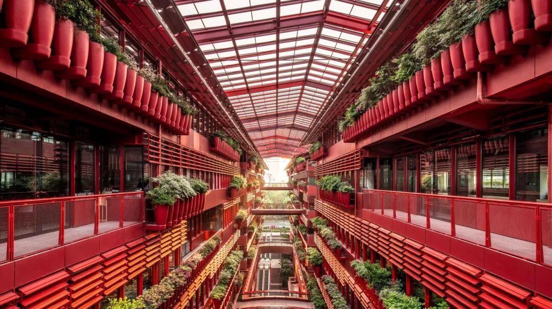 毗邻徐家汇路最南段,依然很好逛。恒基·旭辉天地是建筑大师让·努维尔在中国的首个落地作品,以红与绿的碰撞、2500个花钵构成的垂直绿化立面,一直是社交平台上的网红打卡地标。这里首店租户占比近六成,网红店占比超两成,张扬的丹霞红,在新年尤其喜气。