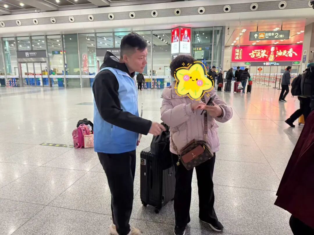 初次参加志愿服务的李楷文在出站口附近发现一位怀抱婴儿、手拖行李箱的女士正四处张望。他主动上前询问,得知对方想找出发层,他当即接过行李箱,引导其前往。路上留意到女士不时查看手机车次信息,便主动询问,发现该车次即将开始检票,他快速规划路线,一路陪同送至出发层进口。