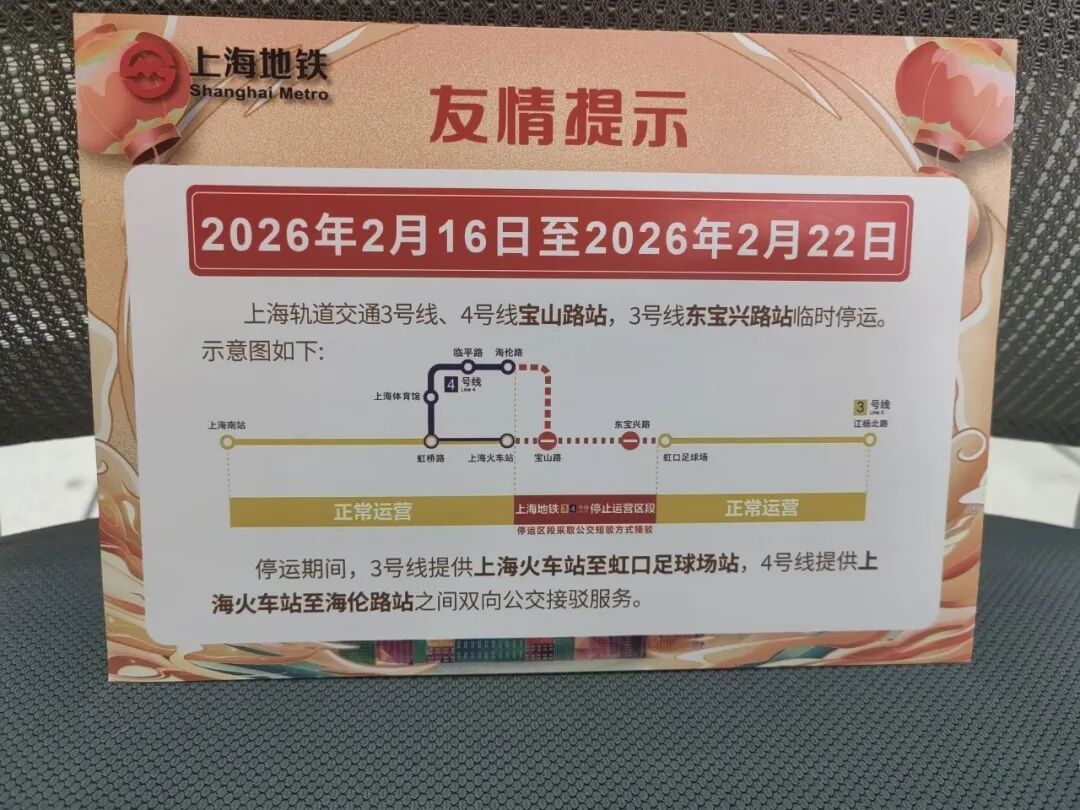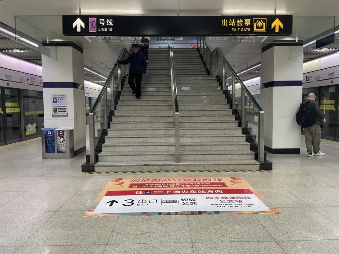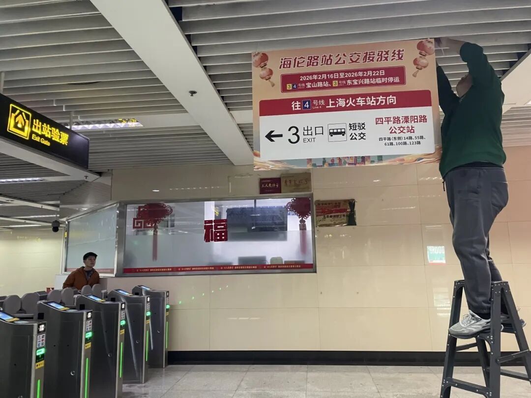 为确保宝山路站施工停运期间的有序运营,3号线4号线相关车站迅速响应,提前步入高度戒备状态,加强预警系统与应急机制的协同联动,确保运营工作安全、有序,全力保障乘客的安全出行。 盘点物资,实现点位全覆盖 应急物资进行清点 车站通过对应急物资进行清点和检查,确保各类物资完备,电喇叭、对讲机、引导背心、引导棒、暖宝宝等各类物资数量充足且无损坏现象,以确保能够迅速调用。 增加导向,助力畅行无忧 进站前:提示前置,主动告知 在3号线4号线沿线各车站进站闸机等醒目位置设置了提示易拉宝,于换乘通道、重点站出口增设友情提示,帮助乘客提前知晓、合理安排。 路径中:连续指引,人员辅助 在公交接驳站内设置公告与指引,沿途关键点位布置方向标识与提示,并在分流节点安排工作人员现场引导,确保乘客顺利抵达公交接驳点。 接驳点:定位明确,快速识别 在公交接驳车停靠点周边,通过立杆贴、墙面标识等方式强化定位指引,实现接驳位置一目了然。 延伸服务:信息随身,随时可查 同步制作并发放便民服务卡片,浓缩了停运时间、公交接驳等信息,方便乘客随身携带、随时查阅。
