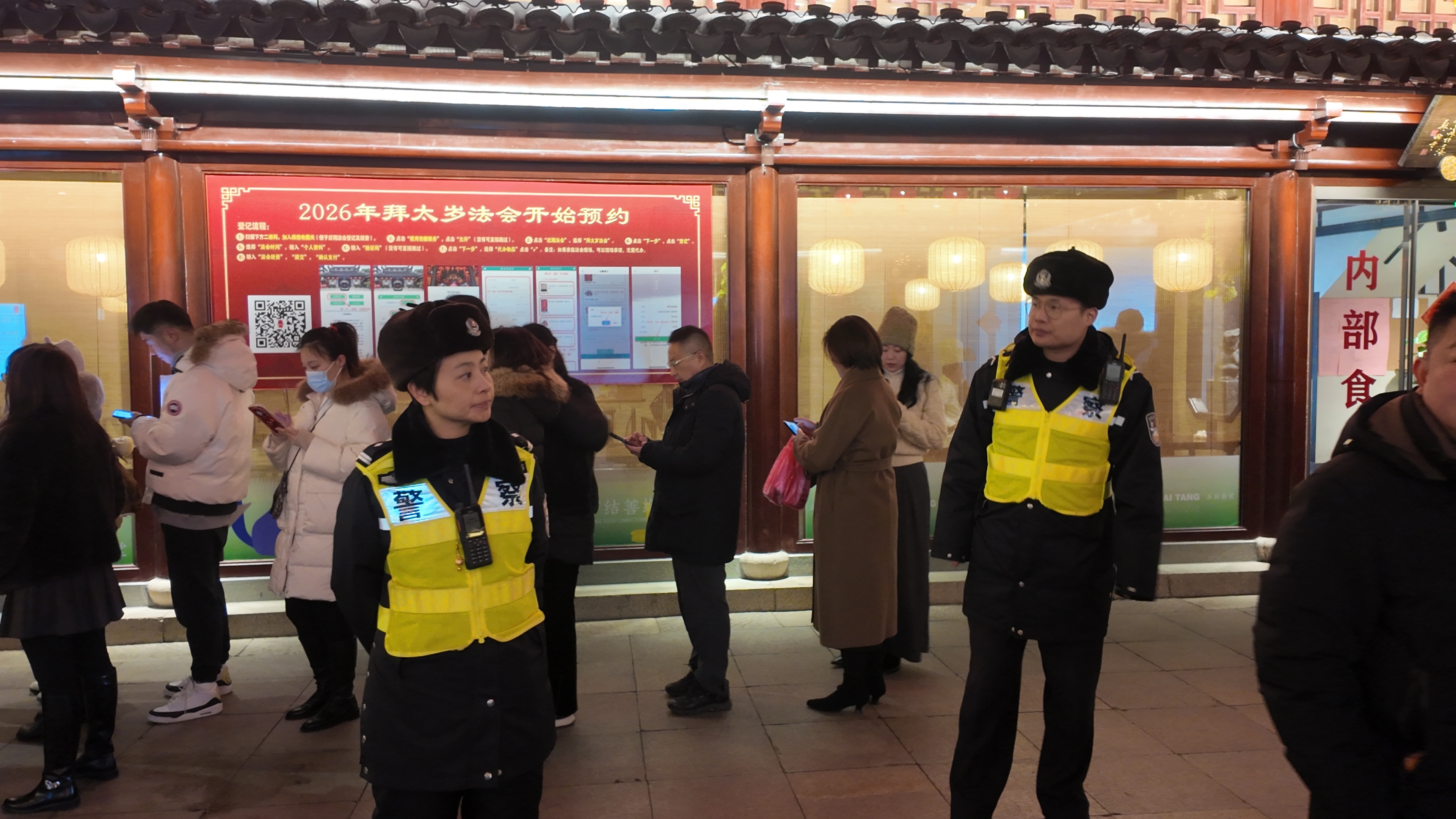 为了应对可能出现的大客流,确保市民游客的安全和祈福活动的顺利进行,黄浦公安部门全员出动,采取了一系列周全的措施。在城隍庙附近,他们设立了蛇形通道,引导市民游客有序进入城隍庙祈福。黄浦公安分局治安支队副大队长李传欣介绍道:“针对大客流,首先我们在这个庙的山门外设置了铁马,然后引导群众缓慢进入。在庙里面,我们安排民警对客流进行疏导,实行单向通行。接近0点出现超大客流的时候,会有民警同志设置拦截线,多次放行,总体确保庙里面的安全和稳定。年初四的时候,按照往年的惯例,客流可能会更大,分局也会有另外的方案,会投入更多的警力,采取上述类似的措施对市民游客进行疏导。”