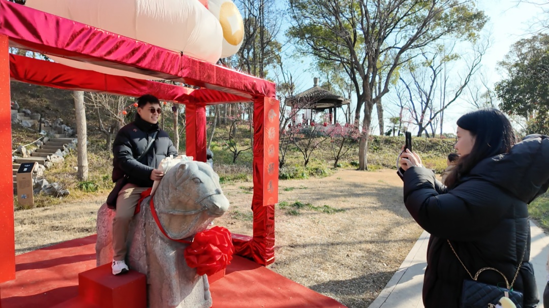 马年新春,公园内人气最旺的当属一尊石马。园方为石马搭建红色拱门、铺上红毯、系上红花、摆上台阶,游客纷纷骑马、打卡,兴致高涨。此外,新年登高寓意好,每年大年初一,爬公园内的金鳌山也成了不少市民的习惯。