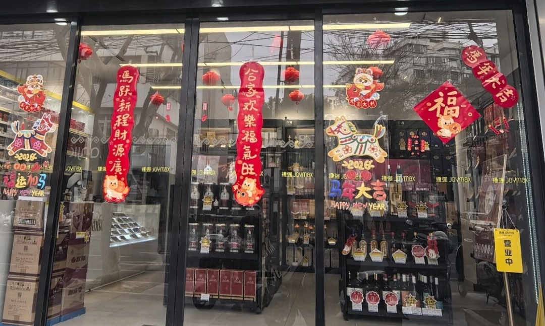 在善业网格,商圈楼宇与沿街商铺橱窗焕然一新,中国红元素点缀其间,烘托出红火热闹的节庆气象。