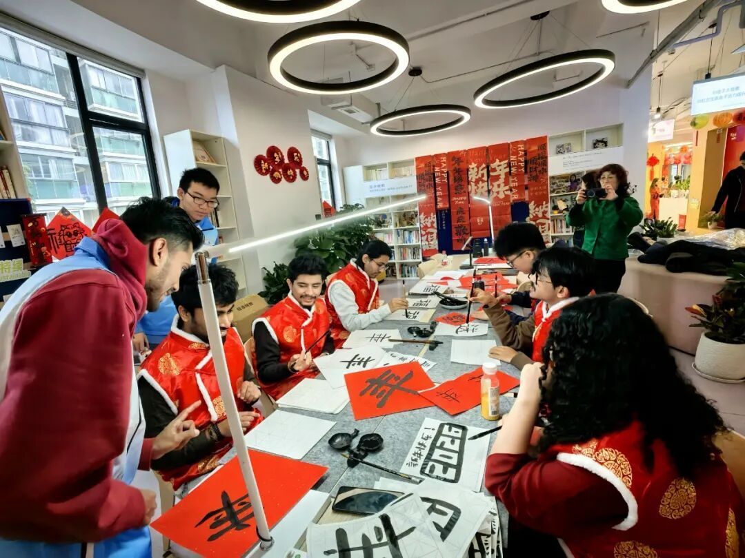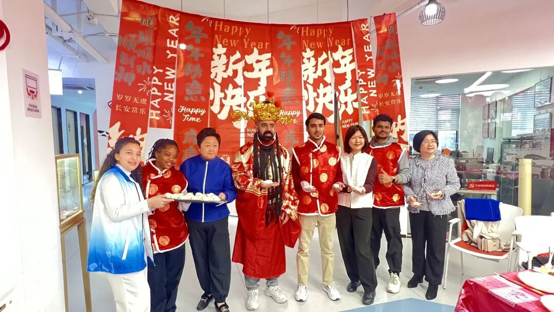 灯笼高悬,彩带摇曳,“财神”在门口热情作揖,逗得刚进门的国际志愿者们连声惊叹。