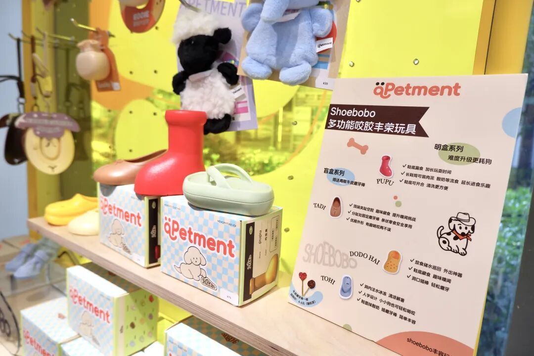 门店汇集了60—70个国内优质宠物品牌,覆盖洗护用品、丰荣玩具、日常用品等,店内不少设计十分富有创意,比如鞋子造型的丰荣玩具,可藏入肉泥、酸奶等流食,延长宠物进食乐趣。