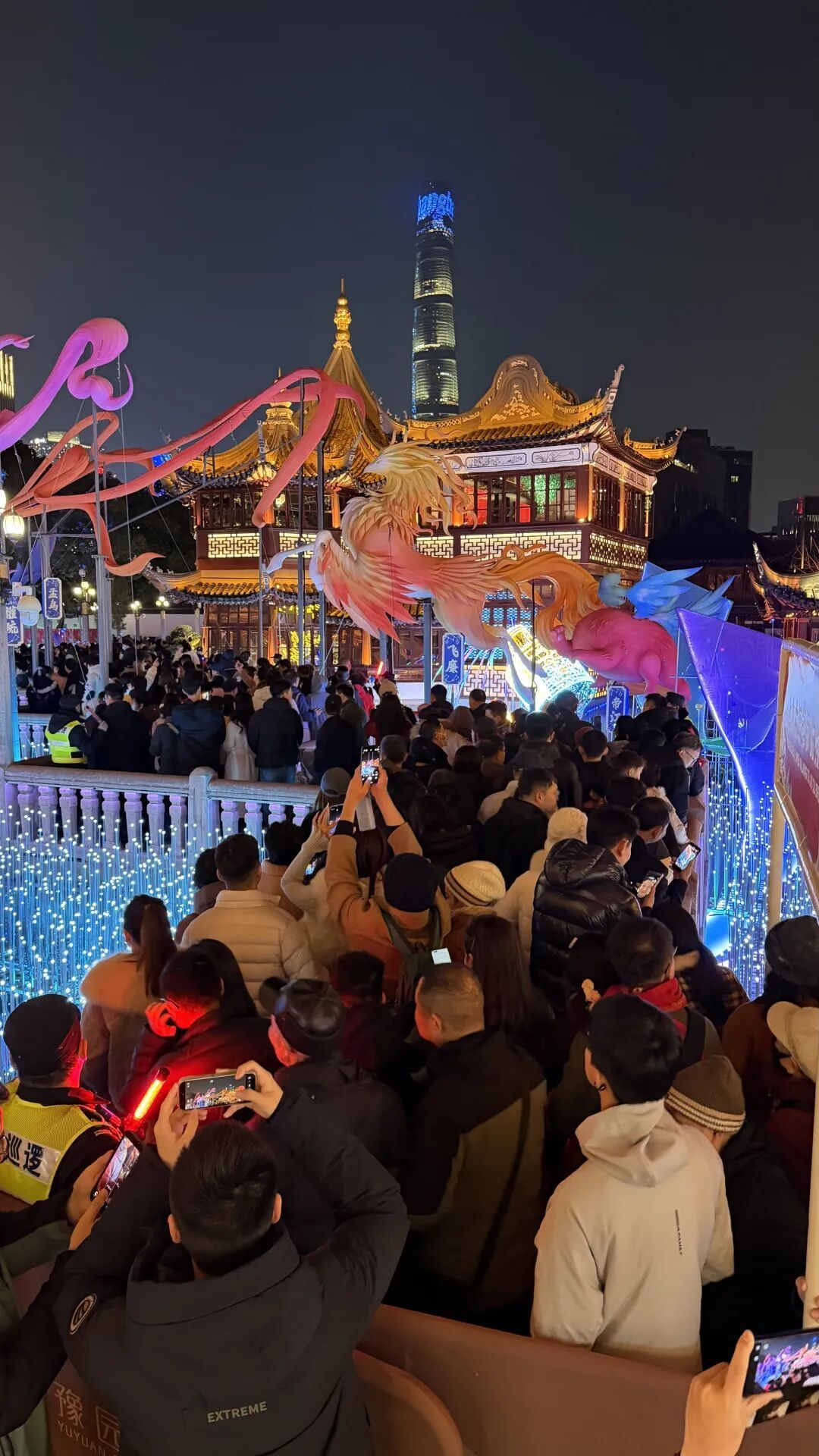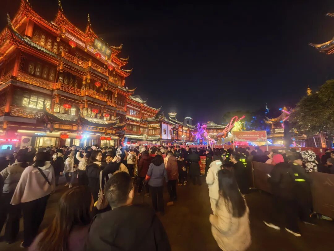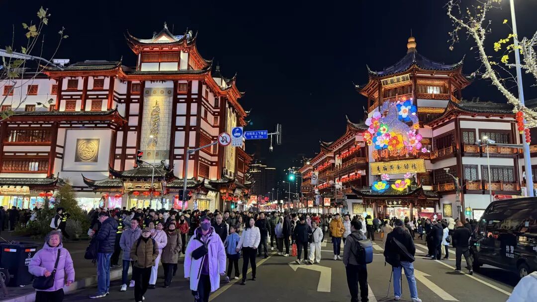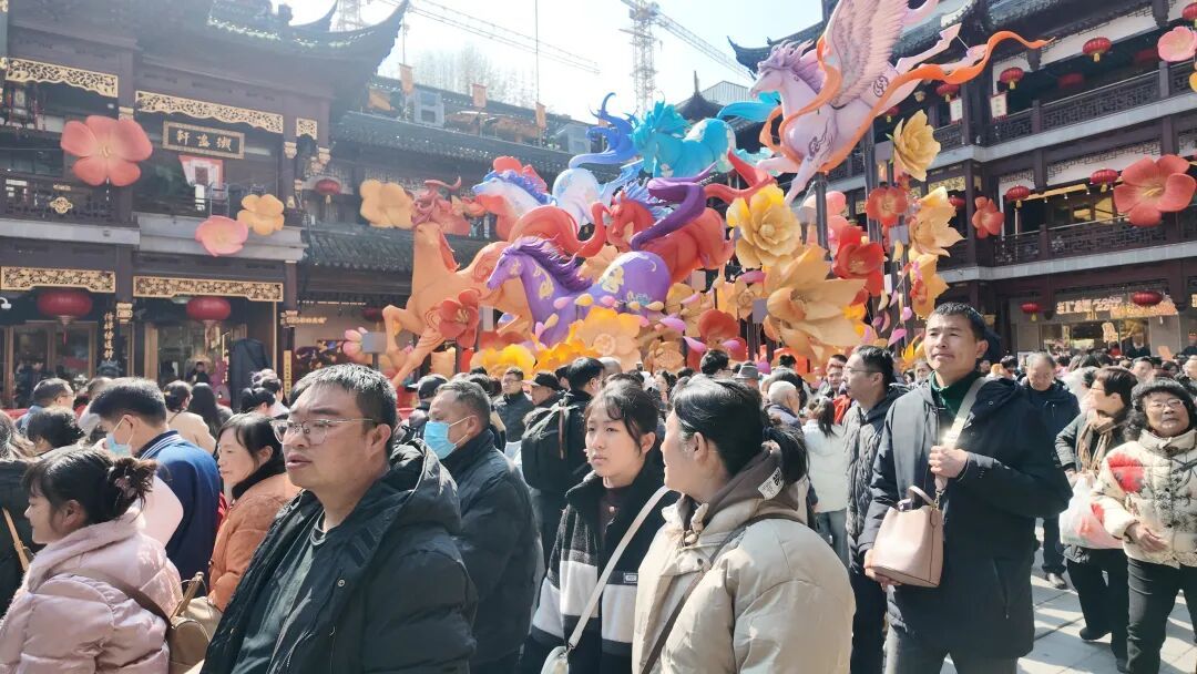 九曲桥畔,人潮涌动。这座承载着老上海人新春祈愿的桥梁,成为市民游客争相打卡的热门景点。市民李女士带着全家老小前来游园,她感慨道:“每年大年初一走九曲桥是我们家的传统,希望新的一年家人平平安安、顺顺利利。”来自苏州的游客张先生则表示:“九曲桥上的花灯太美了,尤其是结合了《山海经》的元素,既传统又现代,让人印象深刻。”