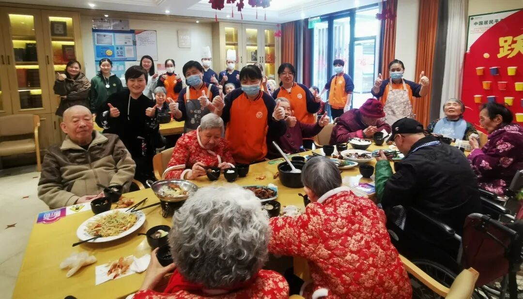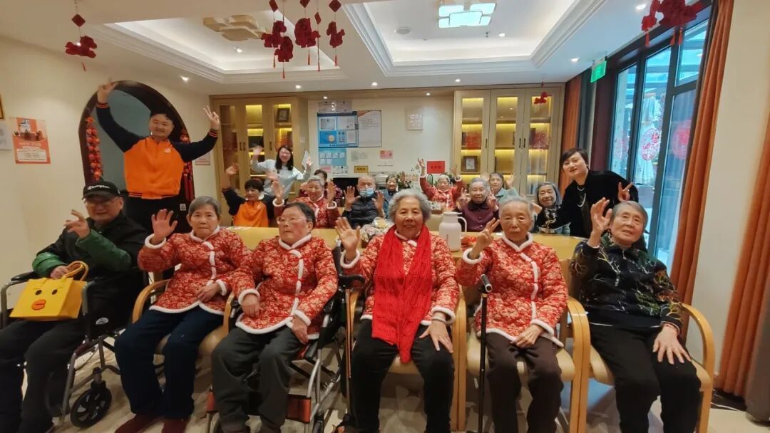 长者照护之家的工作人员与老人们开心过年。