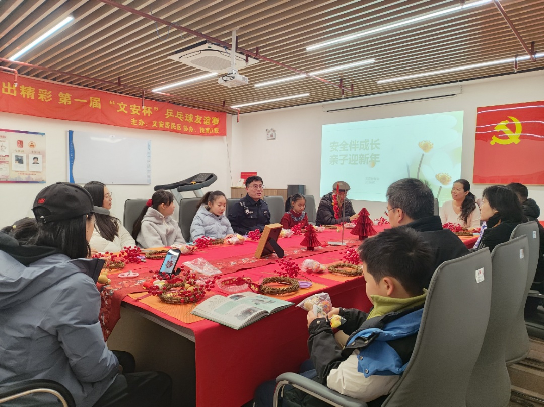 在“安全伴成长 亲子迎新年”主题活动中,社区民警通过案例剖析、趣味问答,将交通安全、防拐骗等知识融入生活场景;在随后的亲子手工环节中,家长与孩子携手制作新年花环,在指尖互动中共迎新岁。