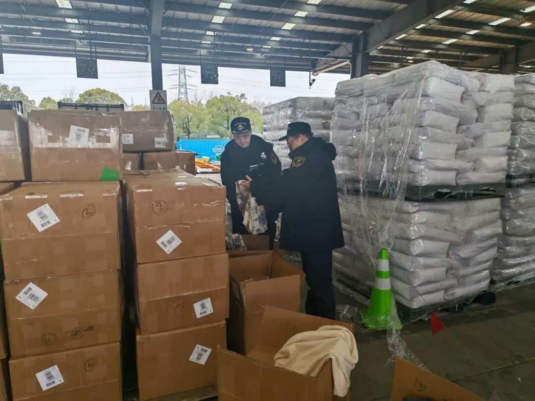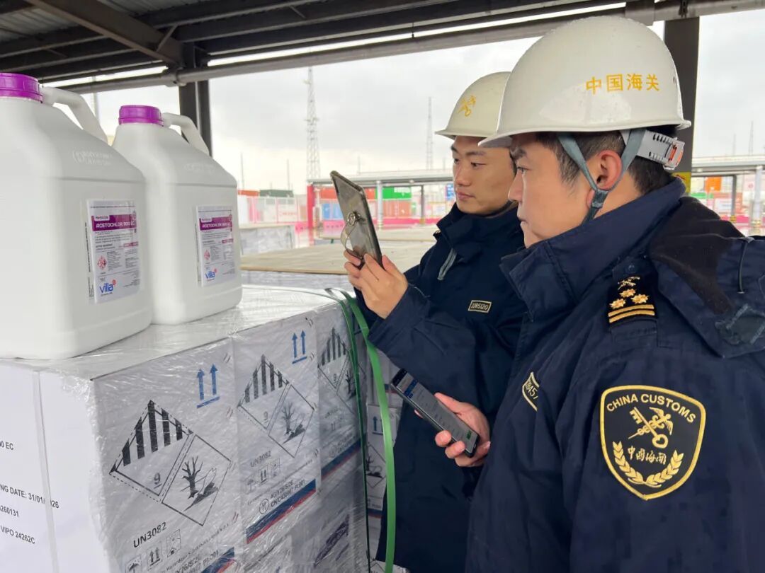 2月17日大年初一,上海海关所属洋山海关关员至洋山危险品监管场地查验农药产品,确保节日通关顺畅。