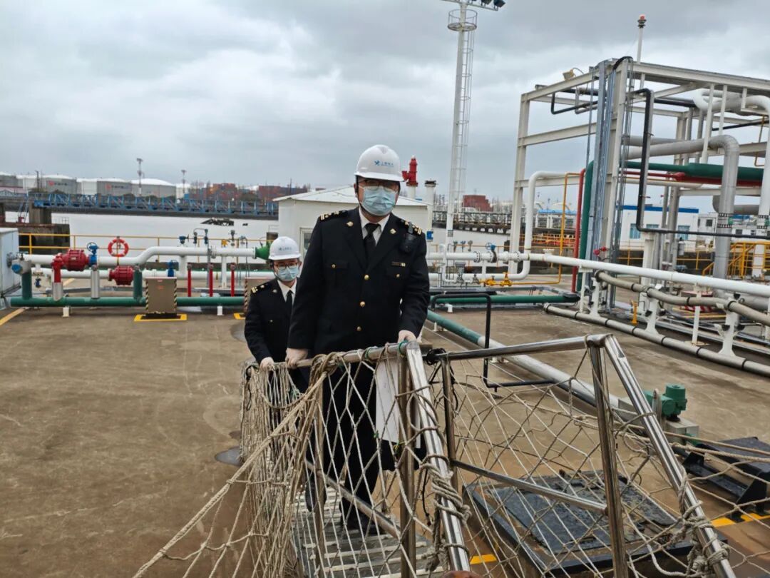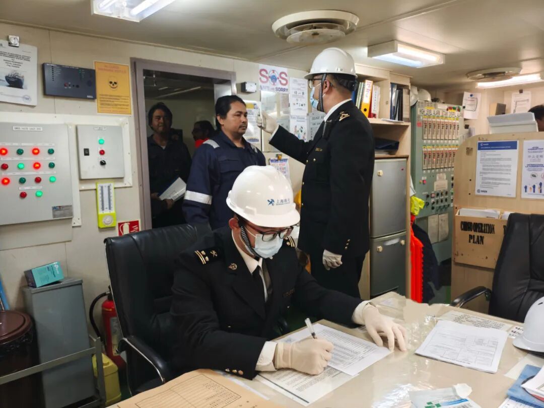 2月16日除夕,上海海关所属浦东海关关员按照布控指令对巴拿马籍“玛丽娜繁荣”轮实施登临检查,为22名船员进行体温监测和健康问询,守护国门安全,保障节日期间贸易顺畅。