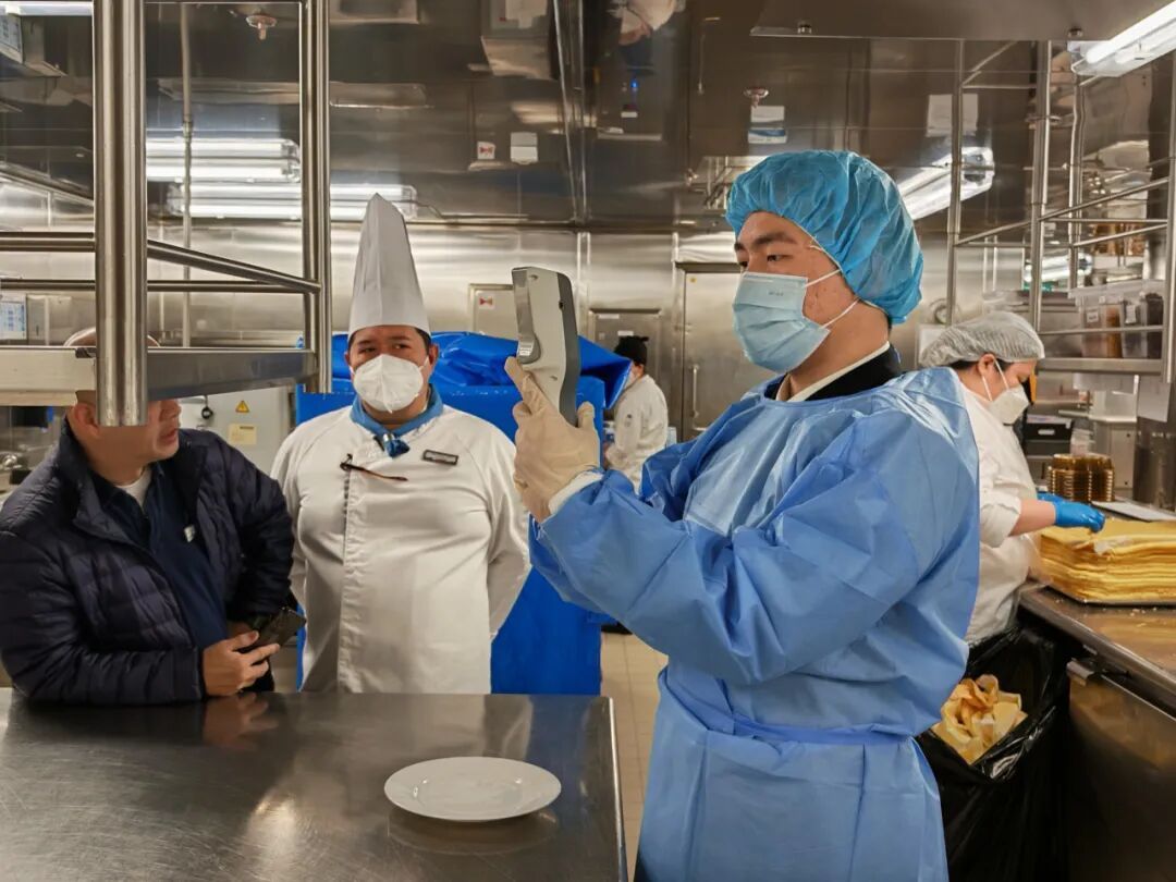 2月16日除夕,上海海关所属宝山海关高效监管“爱达魔都号”入境。清晨7:00,宝山海关关员登上爱达魔都号,对该船食品加工环节开展卫生监督,对邮轮传染病防控开展宣传教育,确保春节期间邮轮乘客吃得安心,过得健康。同时充分运用智慧旅检,提高通关效率,严格落实卫生检疫监管措施,保障春运期间人民群众健康安全。当日共监管入境旅客1419人次,出境旅客3228人次。
