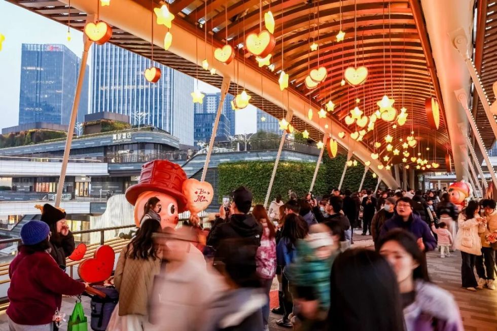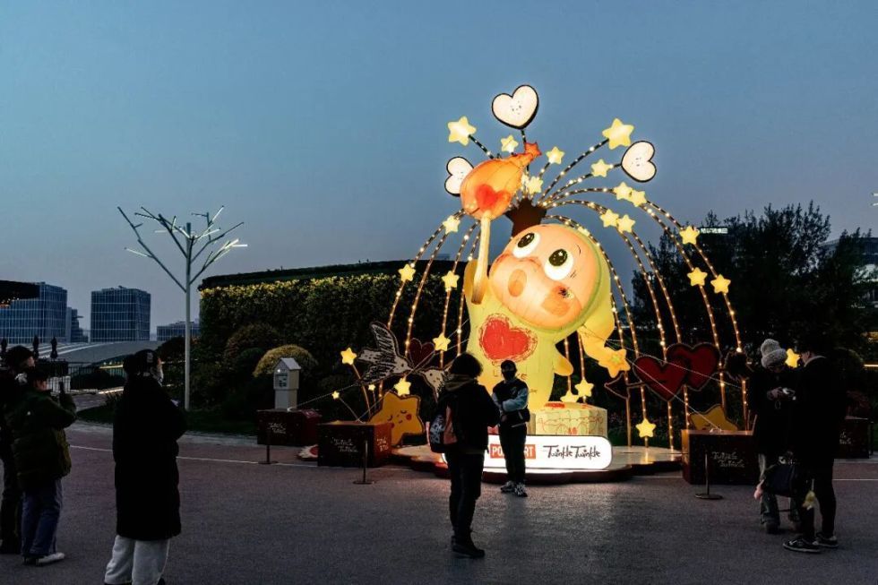 在石区L3层悦目桥,温暖的星光与爱心悬坠头顶,脸蛋红扑扑的“星星人”天真烂漫的姿态迎接过往市民游客。还有石区L4层天空环道(近茑屋书店)、木区L1层泡泡玛特POPMART店铺上方区域……随处可见举着手机与“星星人”合照的身影。