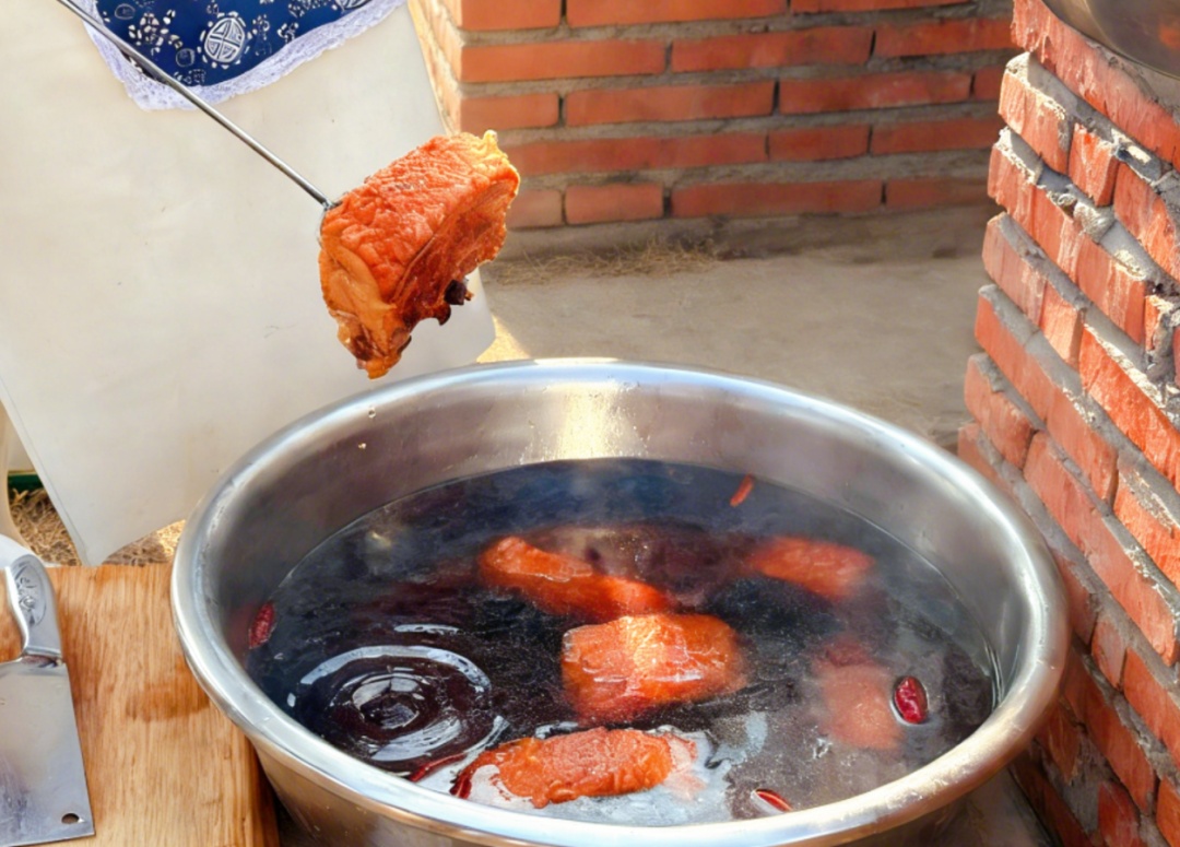泡透的肉切成厚片,接下来就可以红烧。土灶里的火调得温温吞吞,大铁锅盖上木盖,肉就在这文火慢煨中渐渐蜕变。蒸汽贴着锅边袅袅升起,带着酱油、糖与香料交融的醇厚香气。