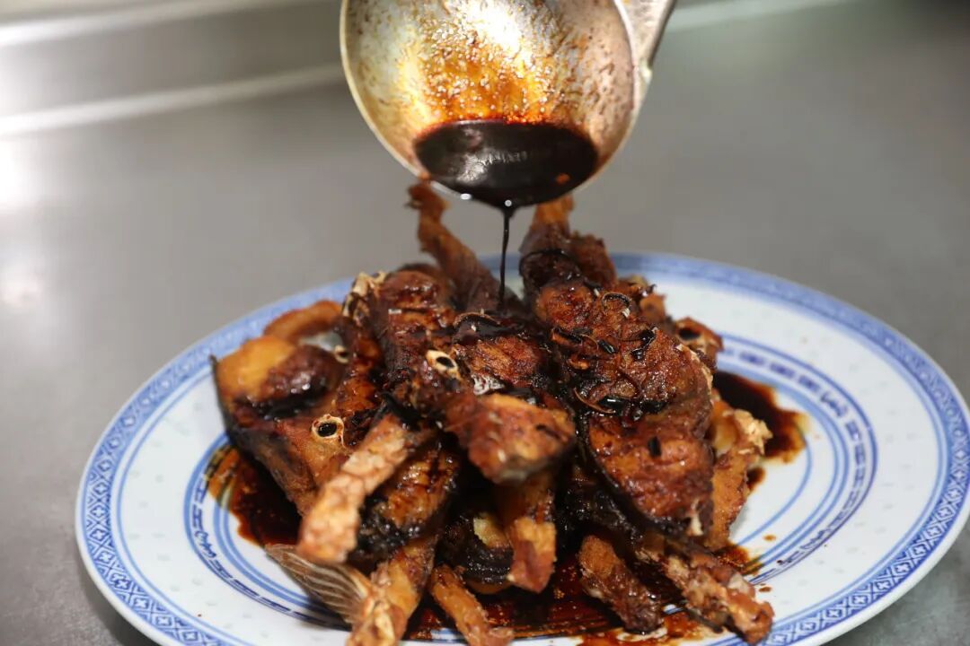 最关键的一步,是那锅秘制的“灵魂酱汁”:老抽、生抽、料酒、冰糖、八角、小茴香、葱段、姜片一同入锅熬煮,待糖色微焦、香气四溢,再将刚炸好的鱼块迅速投入酱汁中“激”一下——鱼肉吸饱浓汁,外酥里嫩,咸甜交织,回味悠长。