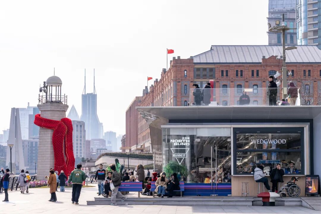 除滨江岸线外,江畔的Manner国客滨江店也借着新春的喜气,成为了游客们争相打卡的热门点位。这家网红咖啡店紧邻世界会客厅,地理位置得天独厚,坐在户外座位上,黄浦江的美景一览无余。