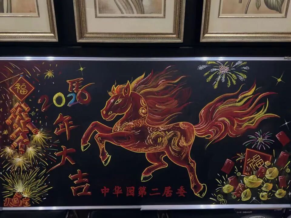 “群英荟萃”“马力全开 再创辉煌”“2026新起点·新跨越·新征程”等话语,都承载着居民们对社区未来发展的美好期待;还有精心绘制的“马年大吉”黑板报,巧妙地将节日祝福与“三清三关”消防安全知识、防范电信诈骗宣传相结合,提醒居民在欢度佳节时不忘安全;景观亭下,一条“股票诈骗花样多,不贪不信不转账!”的反诈横幅悬挂在灯笼之间,这种融合让传统装饰“开口说话”,在潜移默化中提升了居民的安全意识,体现了基层治理的细心与巧思。