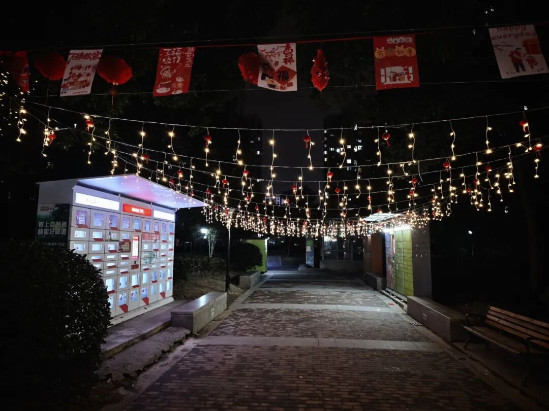 红灯映新岁,福字暖家门。夜幕降临,LED灯串亮起,与红灯笼交相辉映,为晚归的居民照亮回家的路,也点亮了冬夜的温暖。