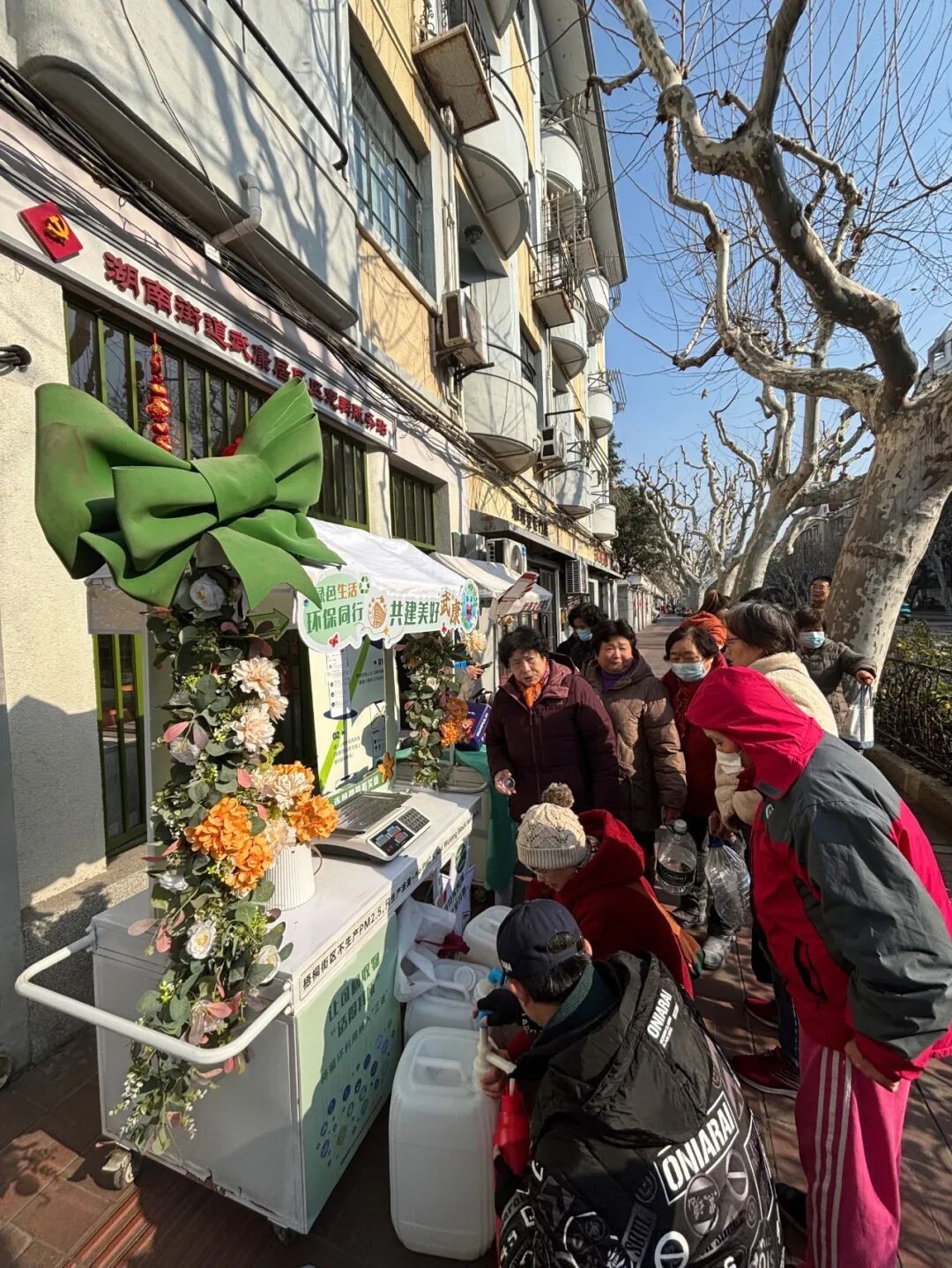 湖南街道会同“沪尚回收”公益组织,联合上海制皂推出了零拷洗衣液便民服务,鼓励更多居民参与。活动当天,尽管天气寒冷,但现场氛围十分热烈,阿姨爷叔们纷纷前来参与,每个人手上都拎着“拷”得满满当当的塑料大瓶洗衣液。