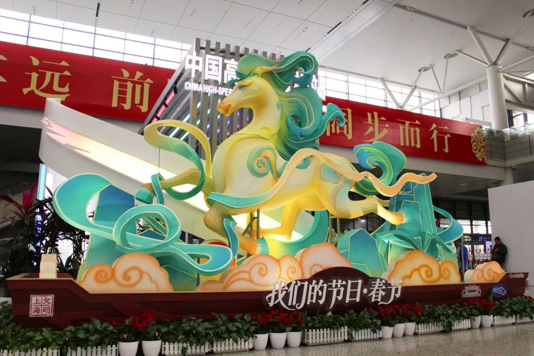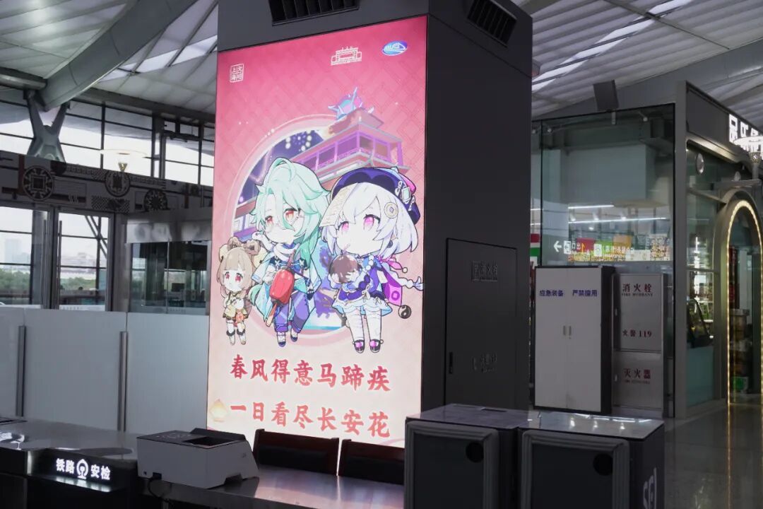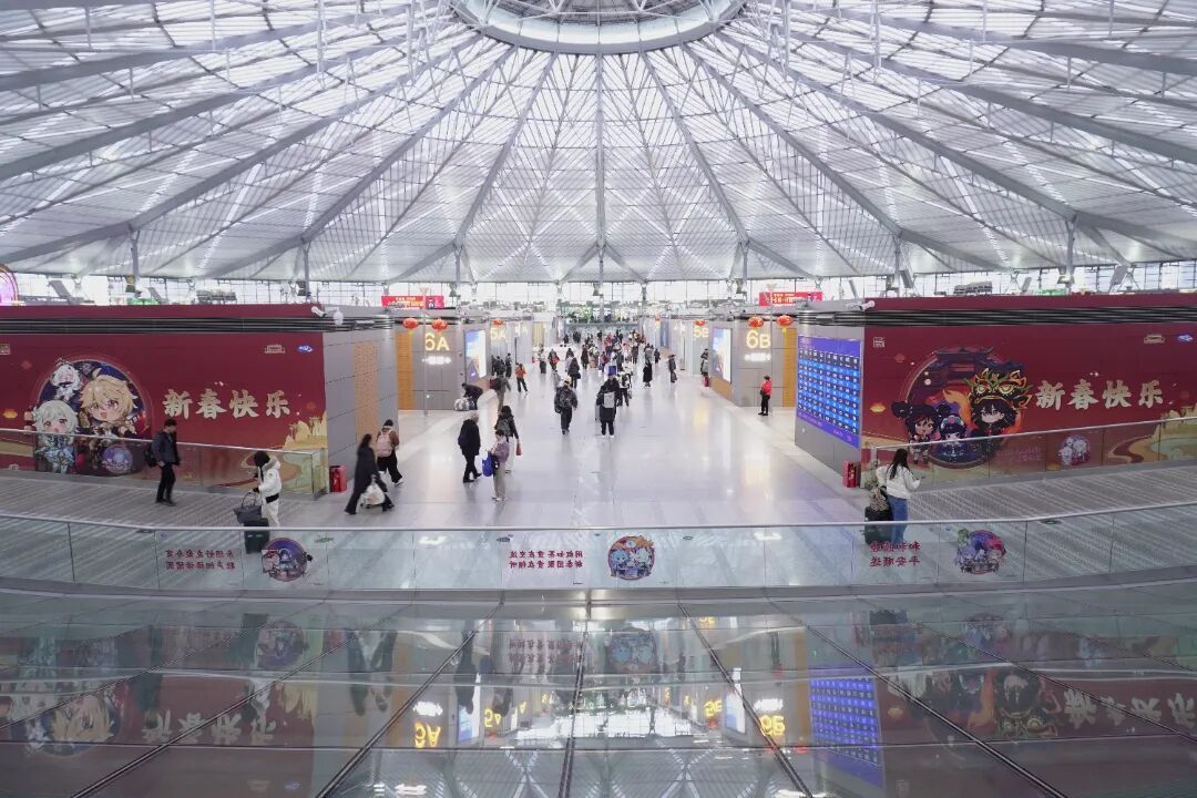 除了巨型装置打卡点,“海灯节”的新春氛围在上海南站内无处不在。在车站的灯箱、立柱道旗、出入口广告牌、装饰墙等位置,印有《原神》角色形象的海报错落分布,包括了云堇、嘉明、香菱等一众玩家们熟悉的来自璃月地区的游戏角色。角色们有的赏灯火,有的在一起吃团圆饭,有的写下节日祝词。“万家灯火映团圆,轻声慢行谱佳篇”“同研翰墨迎春到,笔走龙马绘新图”,一句句新春祝福点缀于海报间,在传递节日温暖的同时,也倡导文明出行的理念。