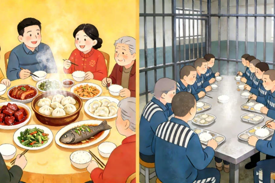 墙外是一桌家常菜,满是人间烟火;墙内是监狱精心准备的年夜饭,暖胃更暖心,在关怀中安心改造。