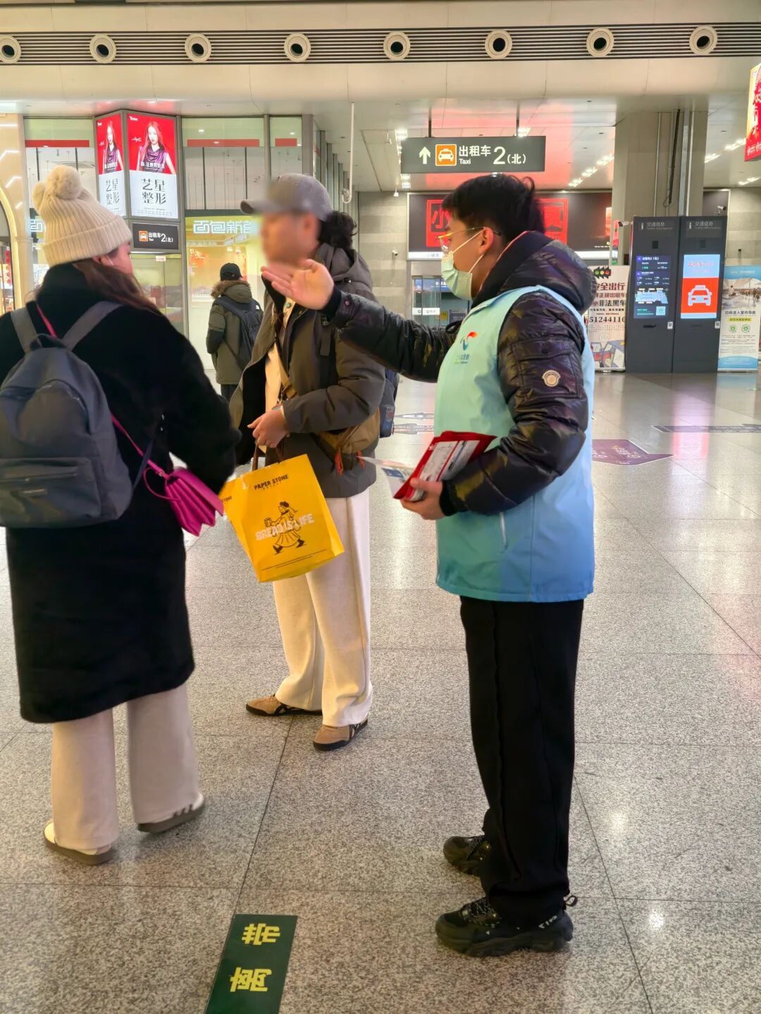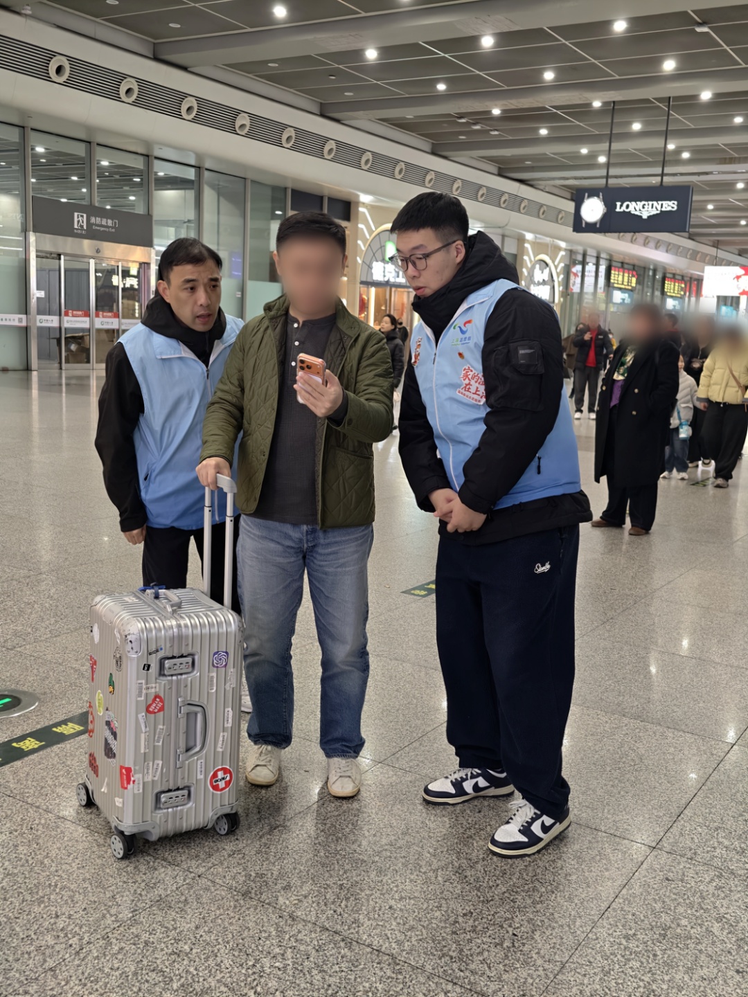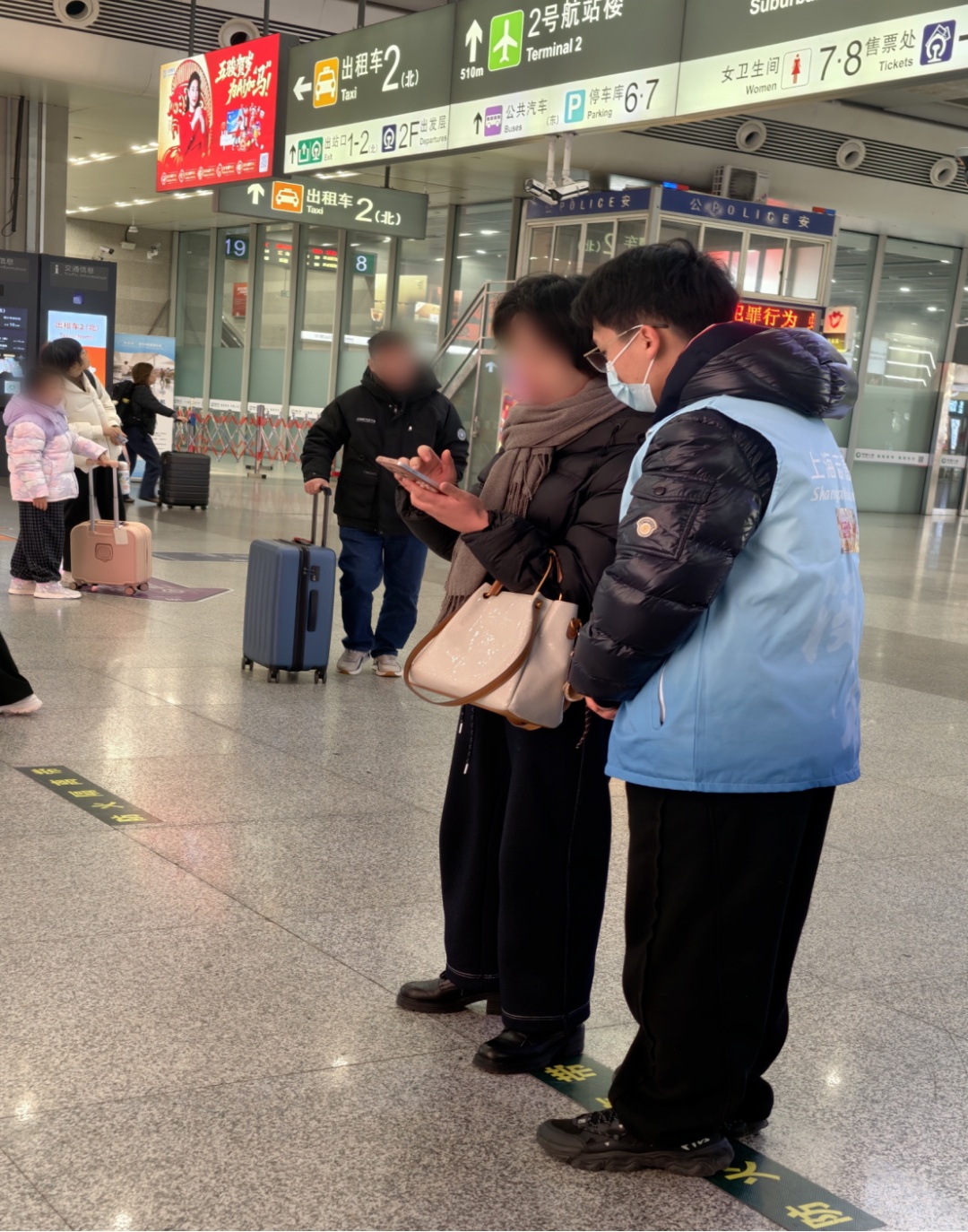 每一问询都关乎旅途,每一次服务都连着喜悦。2月17日(大年初一),在志愿者杨晓冬的带领下,来自区财政局的4名志愿者身着蓝马甲,在虹桥火车站化身流动“问讯台”、旅客“贴心人”,用耐心指引、暖心帮扶,为春运旅途增添浓浓暖意。