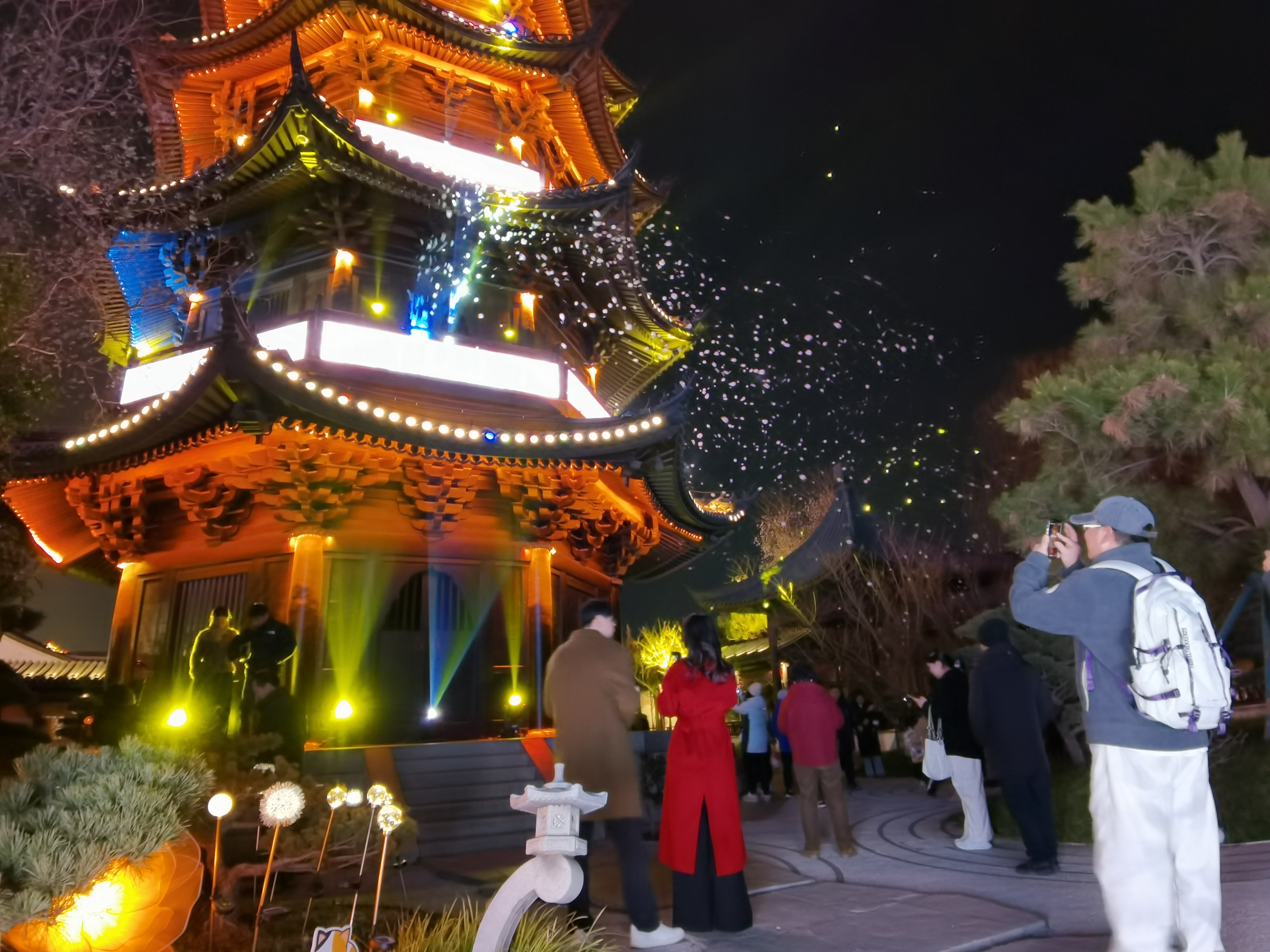 夜幕降临,泗泾古镇华灯初上、熠熠生辉。安方塔流光溢彩,“泗泾有戏”IP人物“小泗”“菁泾”闪亮登场,骏马踏云灯组气势十足,光影交织间尽显江南古镇韵味。塔园内,“光绘泗泾”灯光秀精彩上演,五彩光束点亮夜空,梦幻场景引得家长带孩子驻足观赏,孩子们追逐着彩色泡沫,欢声笑语不断。