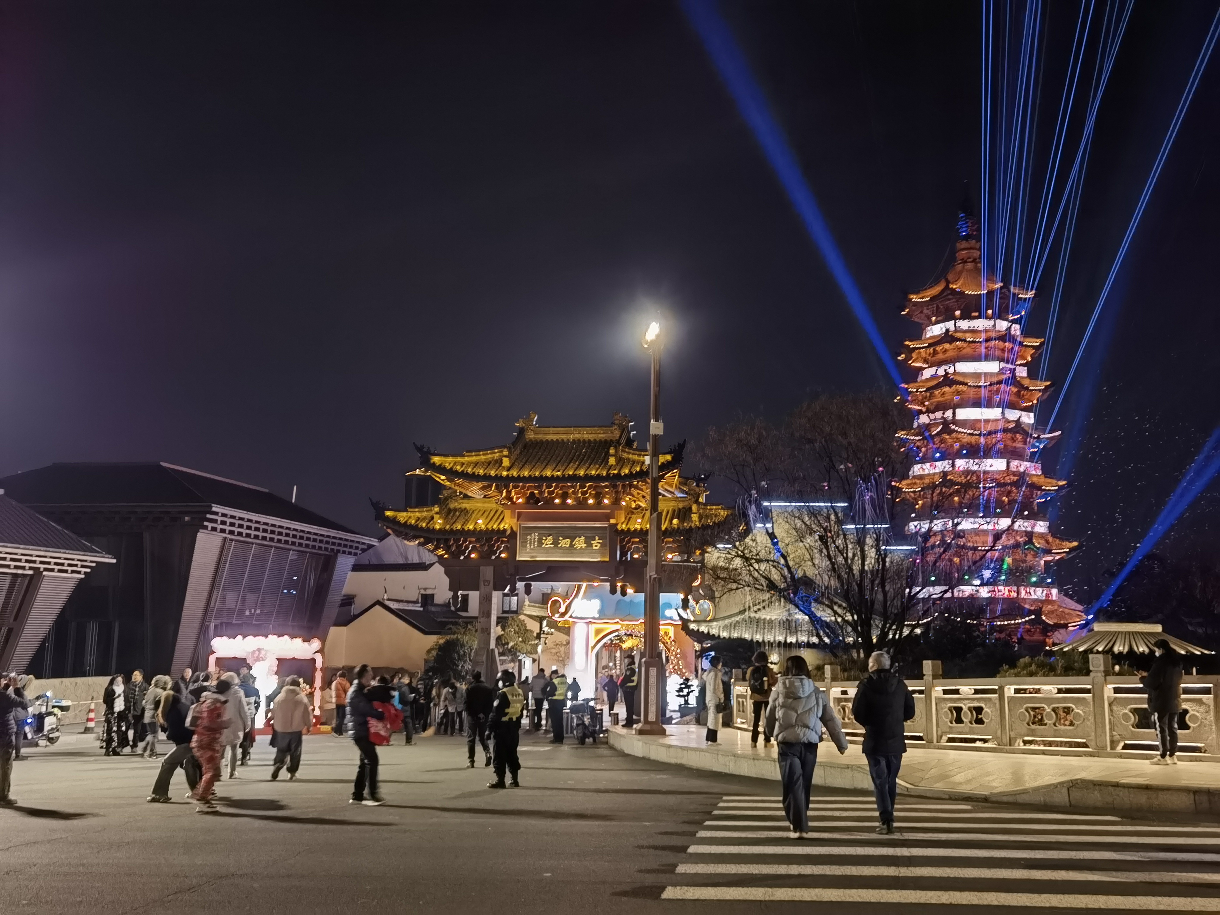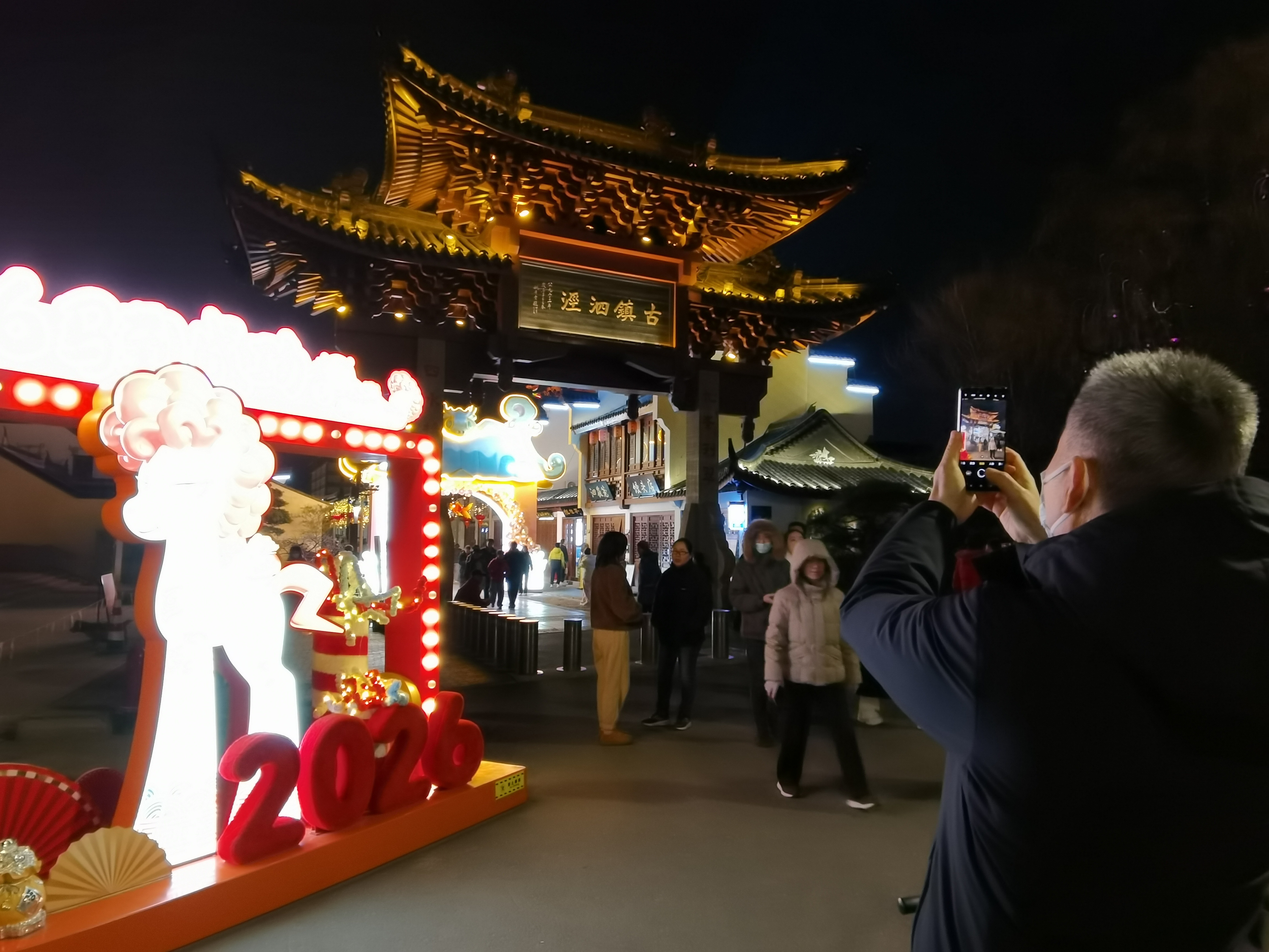 古镇街巷内,新春集市人气火爆。沿街商铺与特色摊位琳琅满目,非遗手作、文创好物、特色小吃一应俱全,市民游客漫步青石板路,逛市集、品美食、挑好物,沉浸式感受烟火年味。市民赵女士今年把父母接到松江过年,趁着假期带家人游览上海各大景点。“我们刚逛好泗泾夜市,就顺道过来想看看夜景,感受一下新春氛围。”赵女士告诉记者。记者发现,游客中有不少本地市民,饭后从家中散步而来,十分惬意。