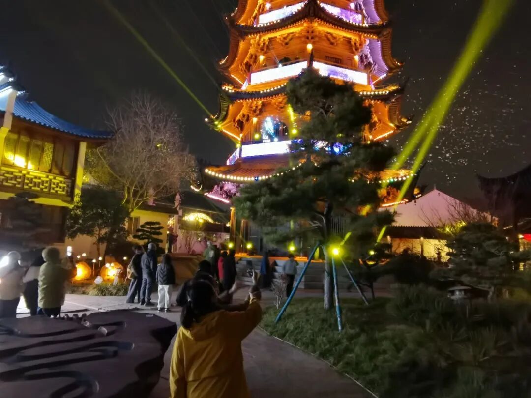 夜幕降临,泗泾古镇华灯初上、熠熠生辉。安方塔流光溢彩,“泗泾有戏”IP人物“小泗”“菁泾”闪亮登场,骏马踏云灯组气势十足,光影交织间尽显江南古镇韵味。塔园内,“光绘泗泾”灯光秀精彩上演,五彩光束点亮夜空,梦幻场景引得家长带孩子驻足观赏,孩子们追逐着彩色泡沫,欢声笑语不断。