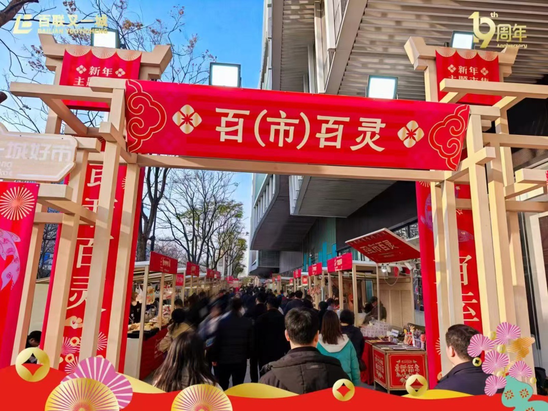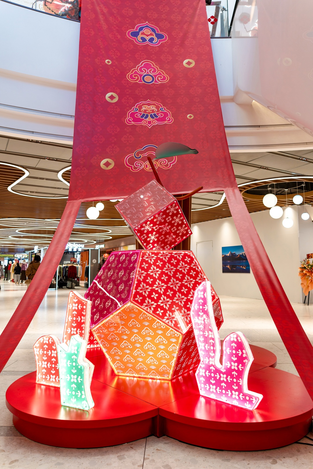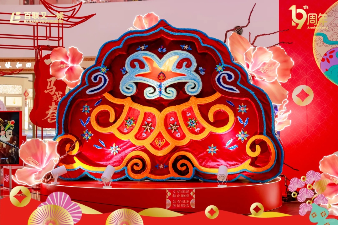百联又一城以"非遗新生"为主题,创新性地将衍纸、花灯、皮影、绒花四项非遗技艺创新演绎为“功成”“如意”“有余”和“福禄”主题美陈,搭配“神力办事处”NPC互动、云花市集和“百市百灵”开年市集,增强逛游趣味。