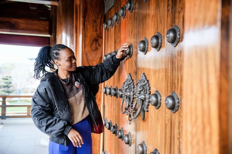 第一站,体验官们来到宝山寺,感受中华传统榫卯技艺的博大精深。来自肯尼亚的苏丹妮对榫卯结构、斗拱、彩绘、飞檐、檐铃深深着迷。她感叹:“家乡非洲也有花梨木,没想到可以建造出如此气势恢宏的仿唐木结构建筑。”