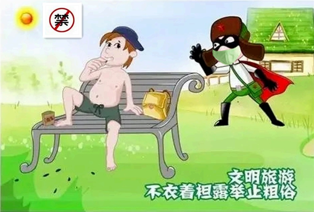 注重礼仪,衣着整洁得体,不在公共场所袒胸⾚膊,不讲粗话脏话;尊重⺠族宗教习俗,尊重外宾及其他游客;礼让⽼幼病残孕,礼让⼥⼠,主动帮助有困难的⼈。