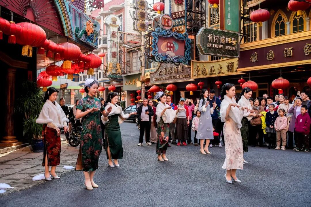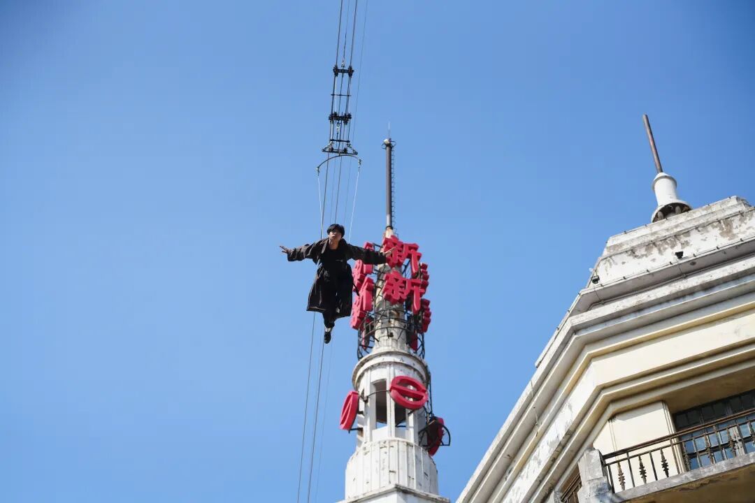 街巷深处,快闪好戏接连登场。漫步于园内黄河路,老上海的市井风情扑面而来。珍华楼门口,伴随一阵婉转悠扬的旋律骤然响起,着各色旗袍的舞者们从人群中款款现身,或手执团扇,或轻挽披肩,在路中翩翩起舞,步态婀娜,裙摆摇曳,举手投足间尽显老上海滩的万种风情。而在园区南京路上空,一场惊心动魄的高空追逐同步上演。演员从高层建筑顶端纵身而下,借助威亚绳索在半空中飞速滑行,将谍战电影中的经典桥段搬至现实。