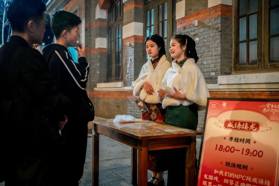 除了目不暇接的街头演艺,园区处处精心铺陈,年味浓郁。黄河路两侧,成排的复古建筑间悬挂起巨大的传统中国灯笼,沿街的老字号商铺门面贴满了烫金对联与玲珑窗花。踏入“雪乡秘境”,人造雪花漫天飞舞,孩子们在雪地里追逐嬉戏,不少亲子家庭慢下脚步,在此打卡留念。