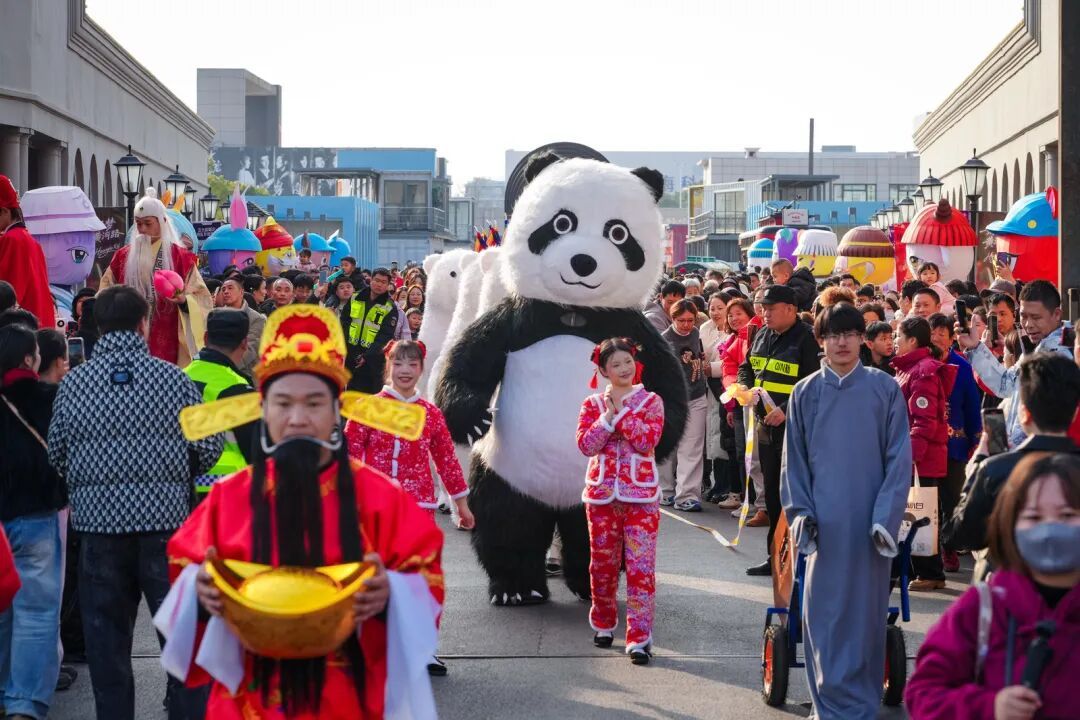 2月18日上午10点半,乐园喷泉池畔满是欢声笑语,身着节日盛装的演员们踏着欢快的鼓点入场。“财神爷”捧着金灿灿的元宝,向入园游客拱手拜年;憨态可掬的玩偶熊摇摇摆摆,不时与孩子们击掌拥抱;紧随其后的醒狮队伍翻腾跳跃,身着华美戏服的京剧人偶队伍背插靠旗,英姿飒爽;更有民俗人物脚踩高跷,与沿途游客亲切互动。巡游队伍沿着道路蜿蜒前行,所到之处,游客纷纷驻足观赏,现场气氛欢快热烈。“场面喜庆热闹,熟悉的年味一下子回来了。”乐女士告诉记者。