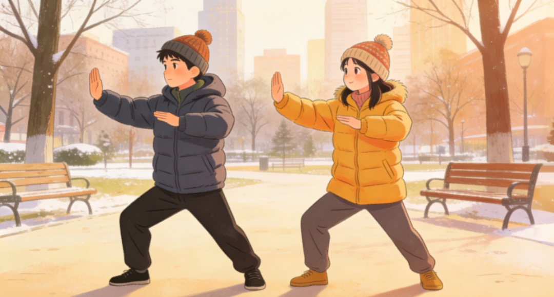 练习前用热水泡脚5分钟(加少许艾叶更佳),再做5分钟动态拉伸:关节环绕(颈、肩、腰、膝)、弓步压腿(左右各10次)、搓手暖耳