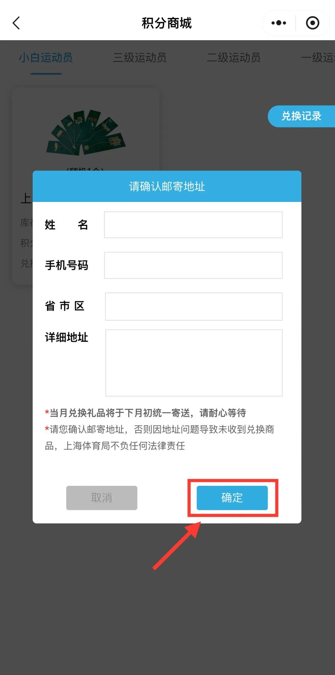 当月兑换的奖品将在下月统一寄送,请耐心等候。最终解释权归上海市体育宣传教育中心所有。