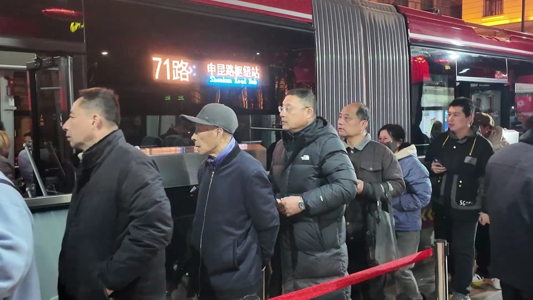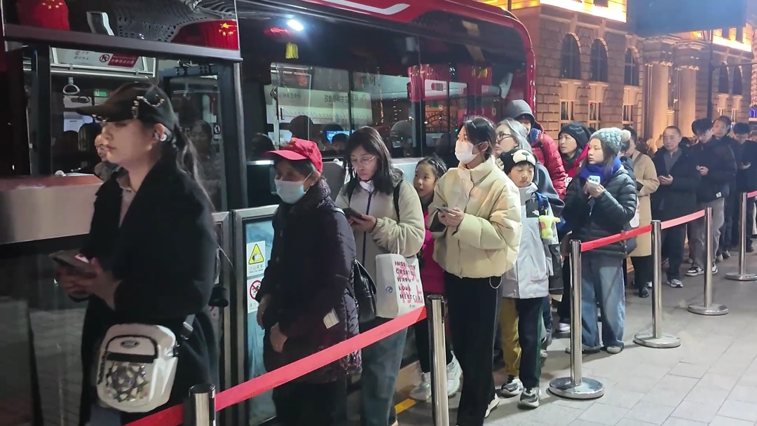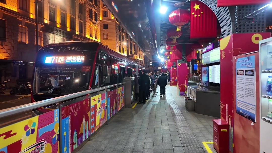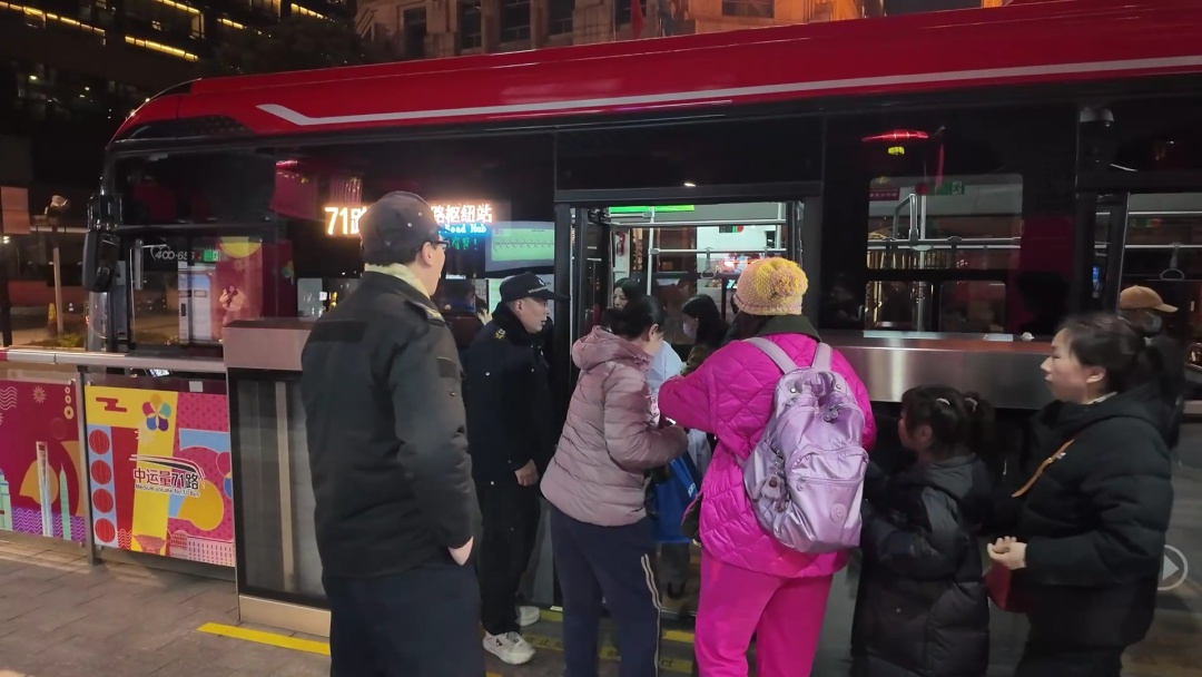 大年初一晚上,华灯初上,外滩流光溢彩,处处张灯结彩,洋溢着浓厚的节日氛围,游人如织,热闹非凡。作为城市交通网络中的关键线路,71路公交车外滩终点站也迎来了新春以来的首波大客流高峰。面对如潮水般涌来的乘客,站点工作人员迅速响应,采取一系列有效措施,确保了交通秩序井然有序。