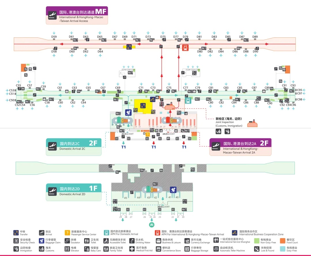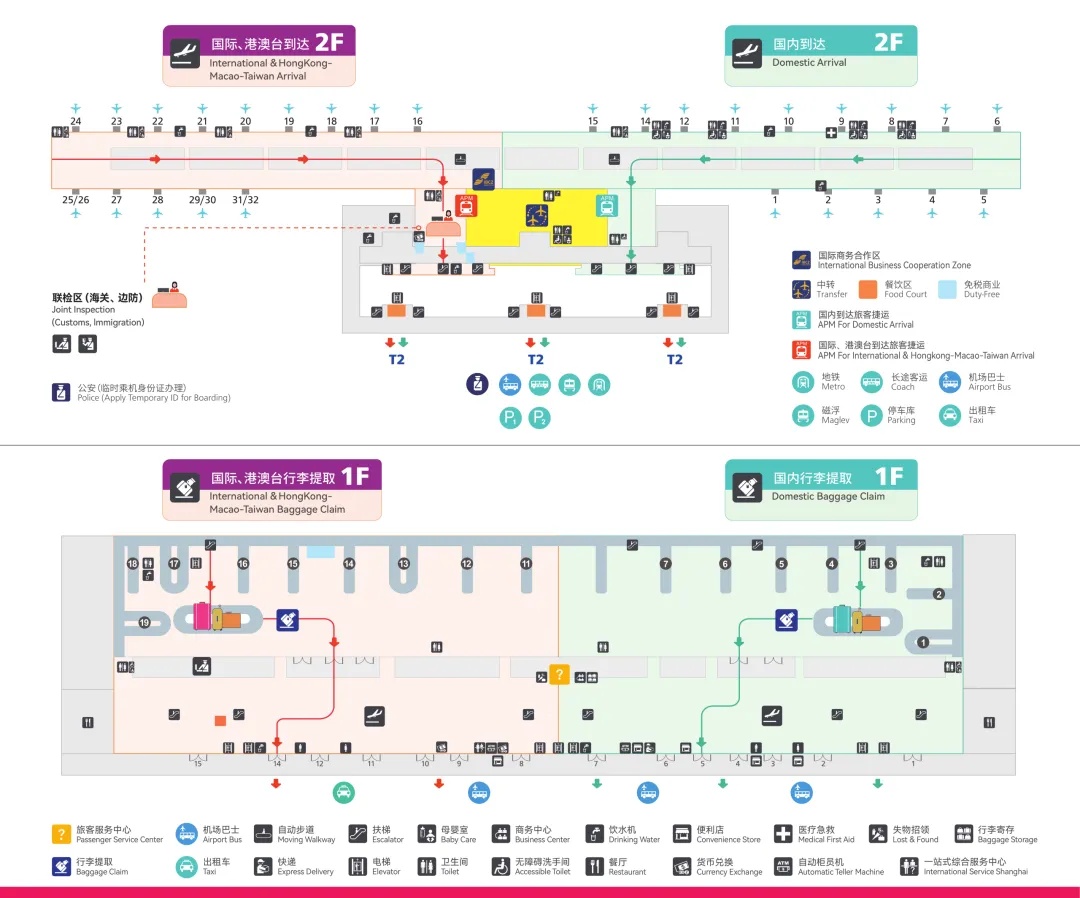 先乘坐电梯到达二层,然后按照上述路线换乘轨道交通2号线、磁浮线、市域线机场联络线↓