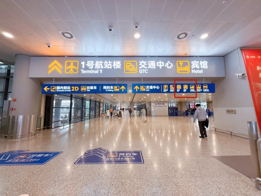 乘坐市域线机场联络线的旅客根据标识,乘坐电梯前往换乘大厅↓