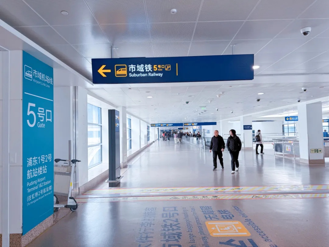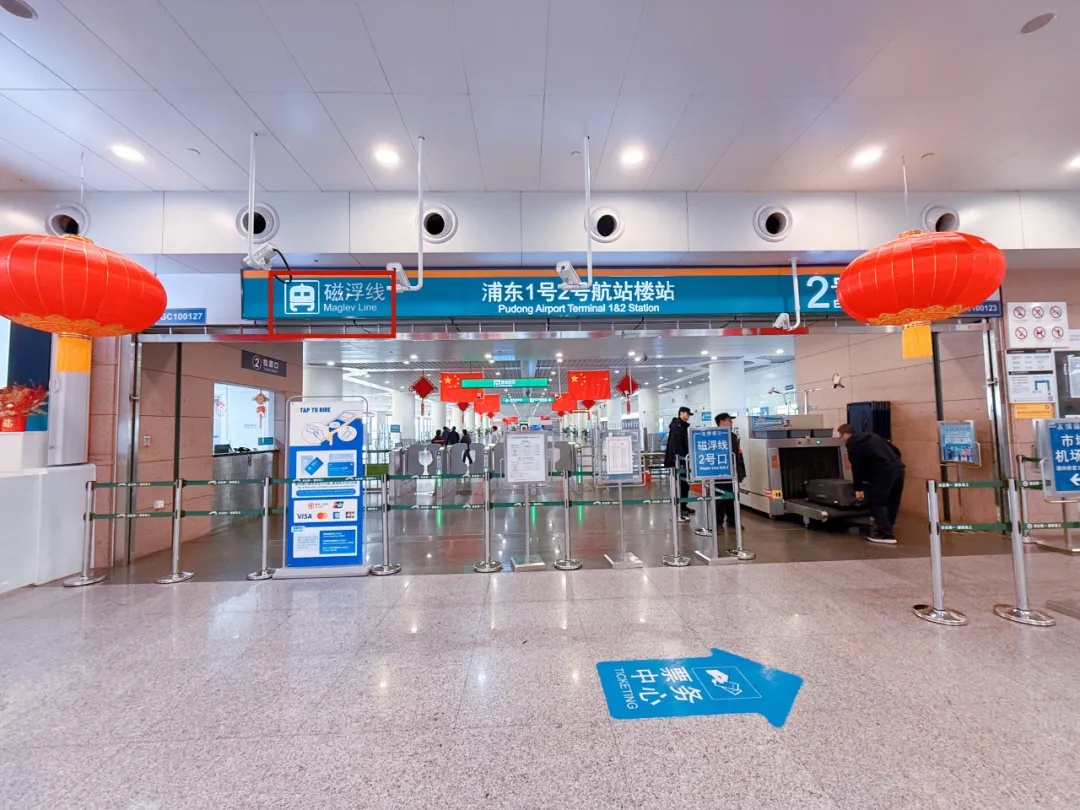 根据标识,步入换乘大厅,一侧是轨道交通2号线进站口,另一侧是磁浮线进站口↓