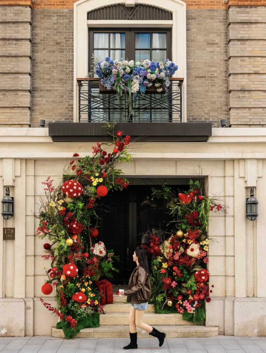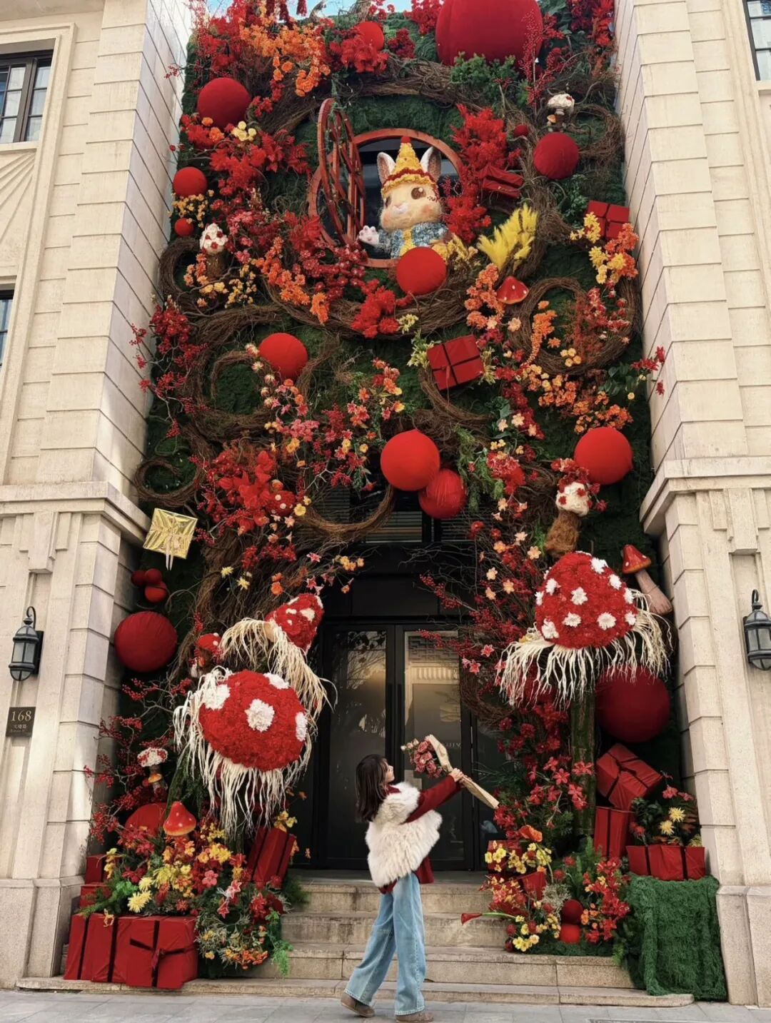 墙面被肆意生长的现代花艺缠绕,藤蔓攀缘间,藏着不期而遇的温柔;巨型红色蘑菇仿佛从童话中跳脱而出,搭配戴着派对帽的萌兔装置,灵动又可爱,每一处细节都藏着惊喜。